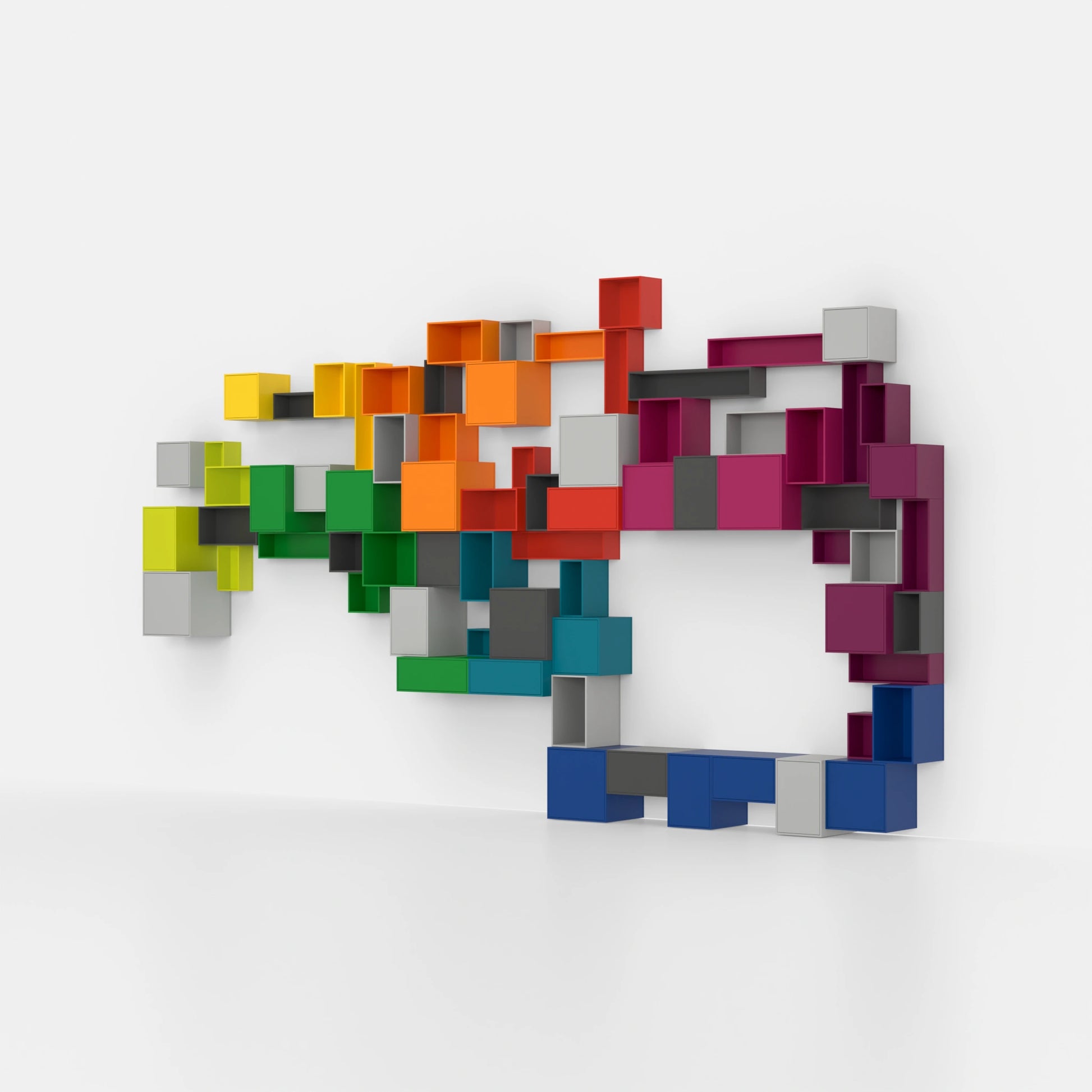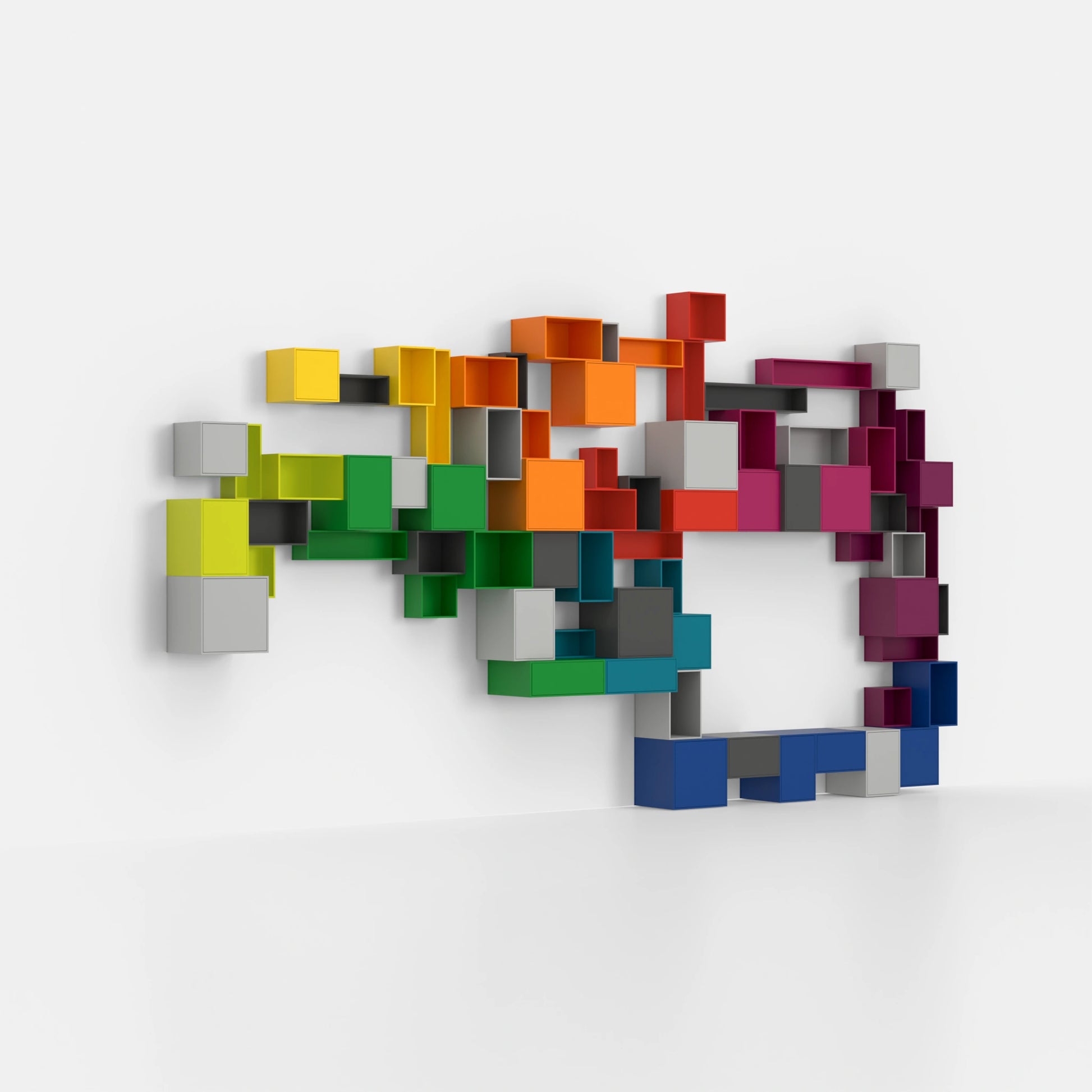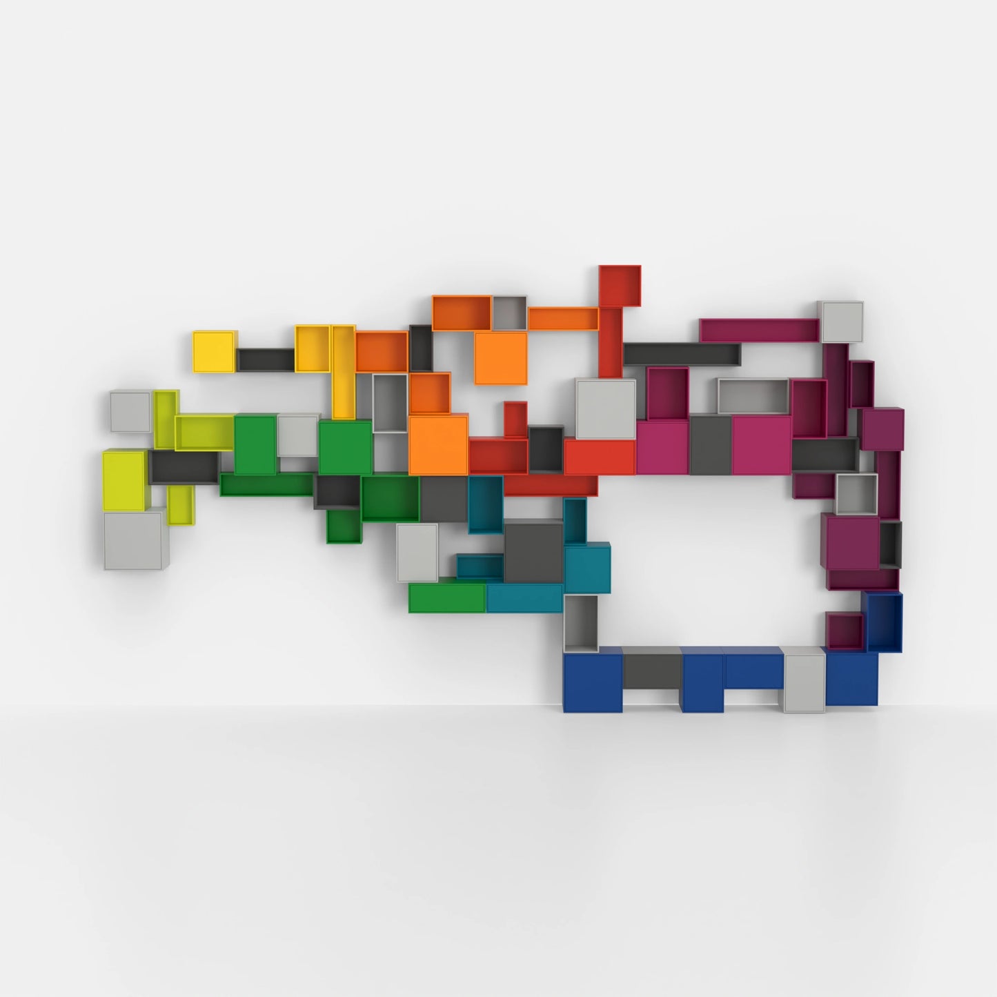Cubit Étagère murale composée de modules colorés dans des tons de rouge, de rose et de jaune, disposés de manière dynamique pour un design d'espace vivant