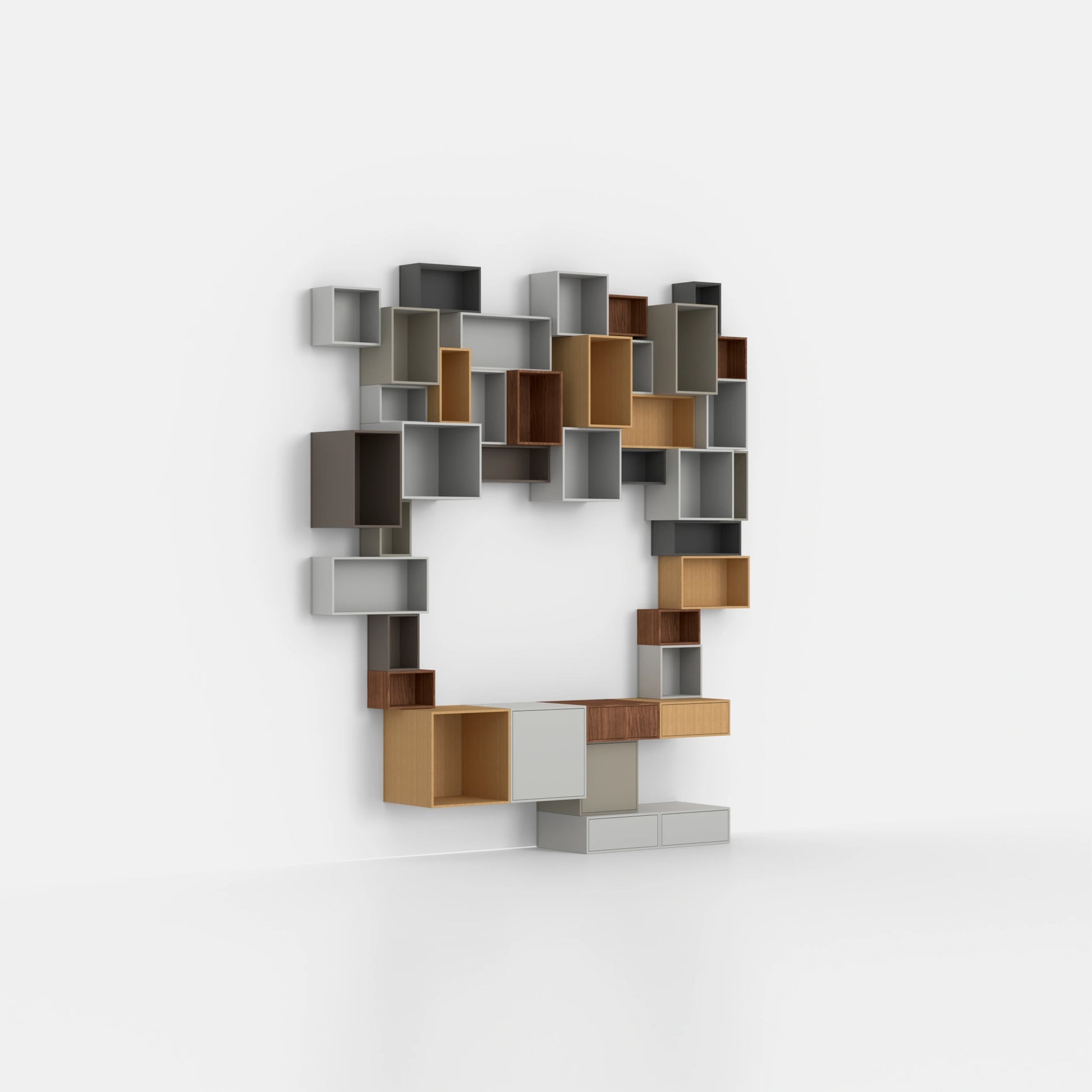Trois boîtes d'étagères modulaires Cubit, deux en vert clair et une en placage de noyer, disposées librement sur le sol, une autre sur une structure métallique noire