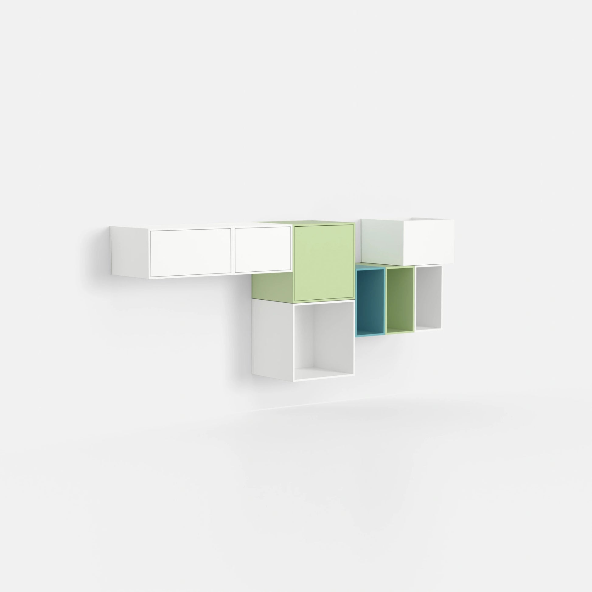 Trois boîtes d'étagères modulaires Cubit, deux en vert clair et une en placage de noyer, disposées librement sur le sol, une autre sur une structure métallique noire