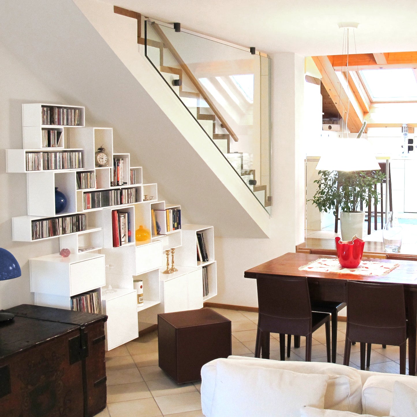 Les modules d'étagères s'orientent vers les formats courants de littérature et de musique, par exemple Din A4, A5, classeurs, atlas, livres d'images & disques. Cette grille de tailles provenant du contenu permet d'obtenir un look sculptural unique.