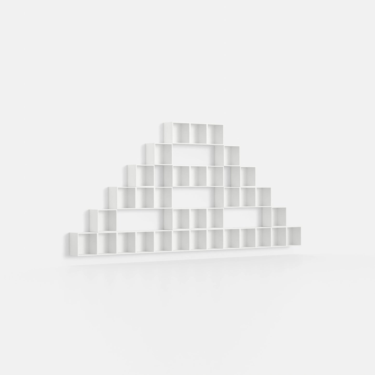 Les modules d'étagères s'orientent vers les formats courants de littérature et de musique, par exemple Din A4, A5, classeurs, atlas, livres d'images & disques. Cette grille de tailles provenant du contenu permet d'obtenir un look sculptural unique.
