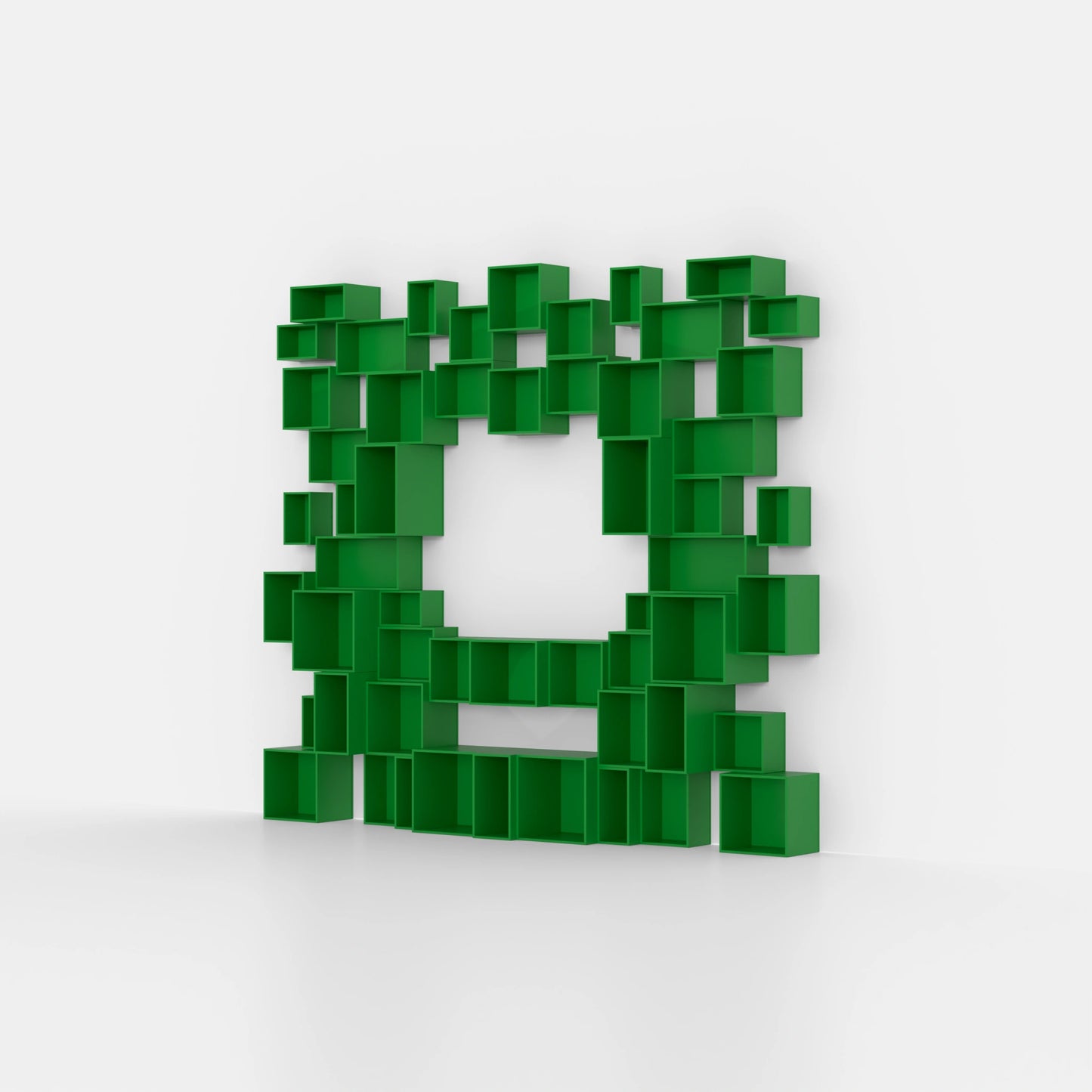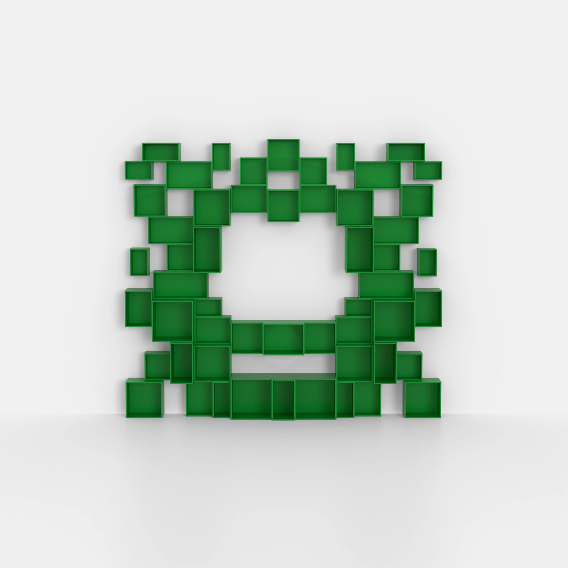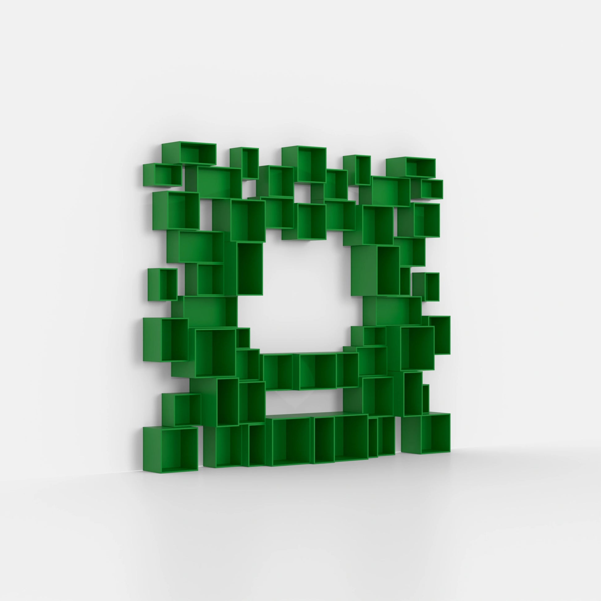 Trois boîtes d'étagères modulaires Cubit, deux en vert clair et une en placage de noyer, disposées librement sur le sol, une autre sur une structure métallique noire