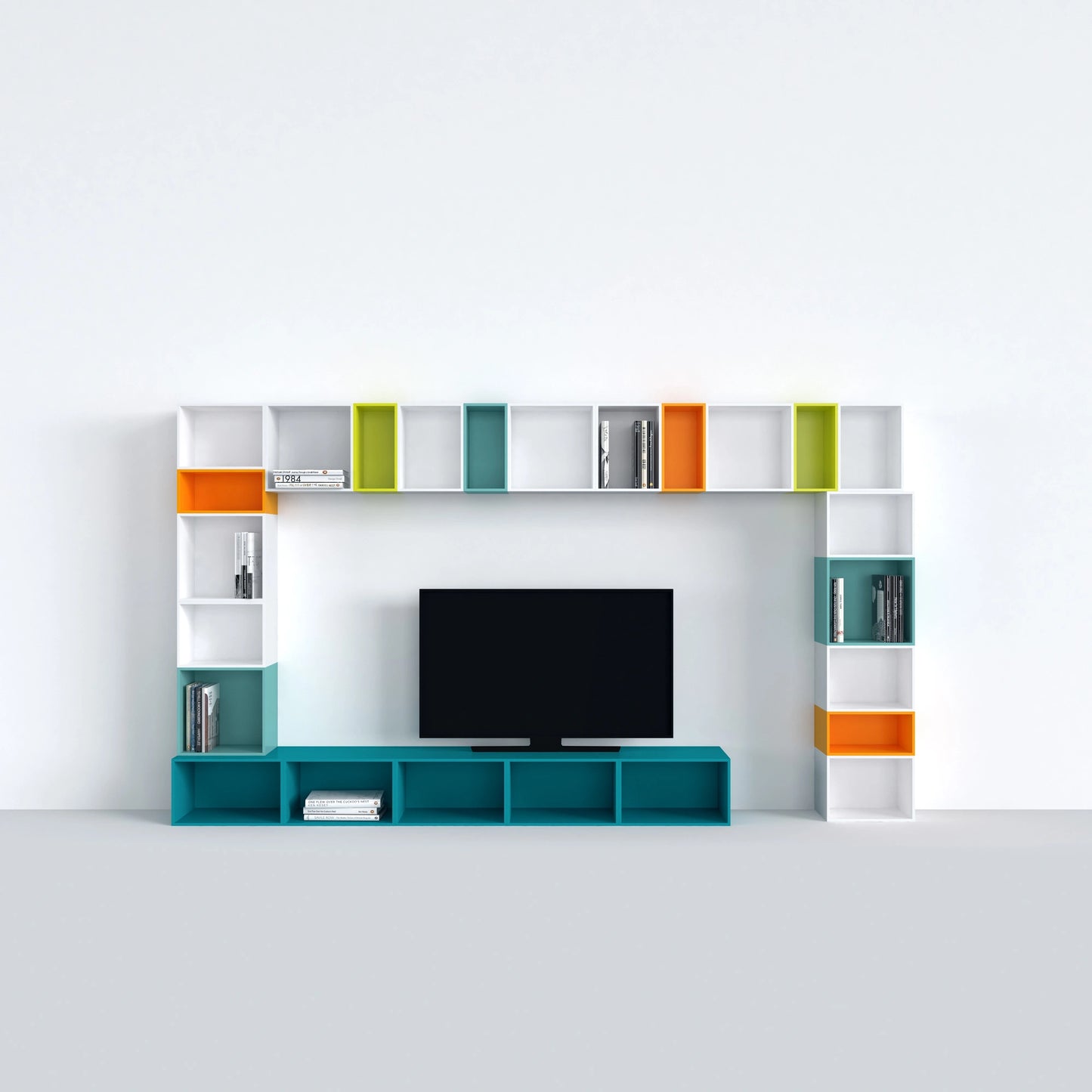 Trois boîtes d'étagères modulaires Cubit, deux en vert clair et une en placage de noyer, disposées librement sur le sol, une autre sur une structure métallique noire