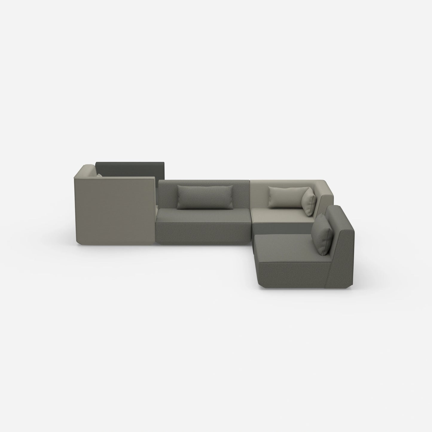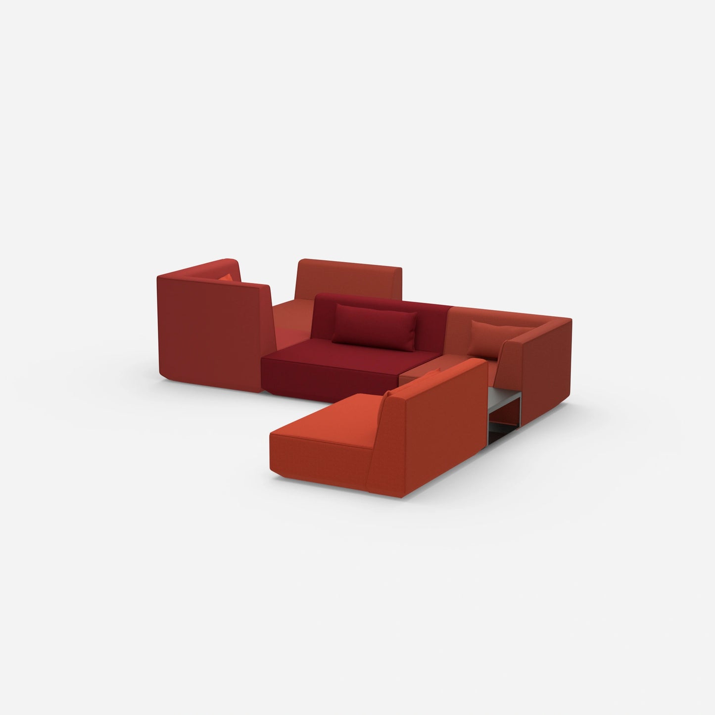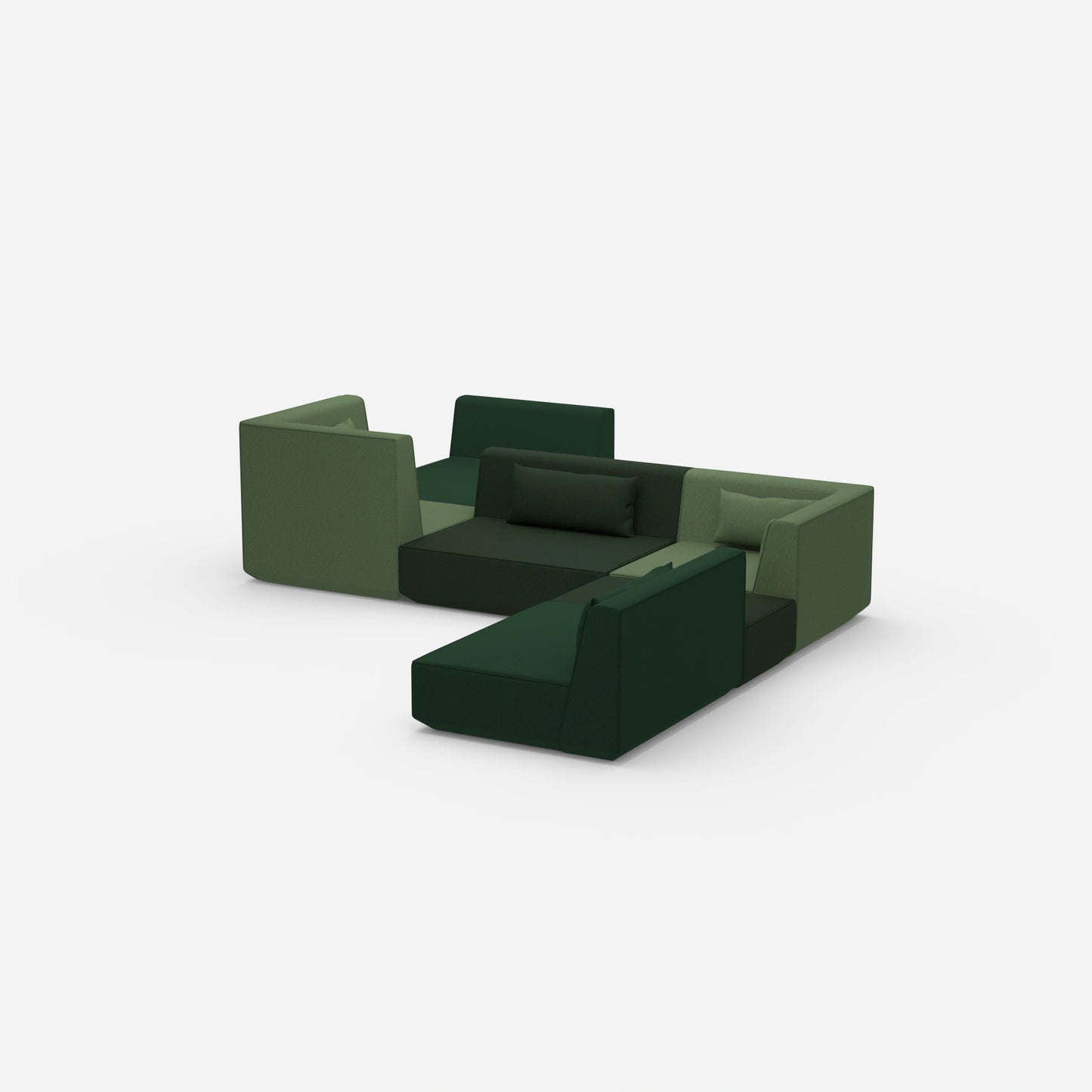 Différents modules de canapés Cubit configurés dans un grand espace ouvert - montre la diversité des combinaisons et des couleurs possibles