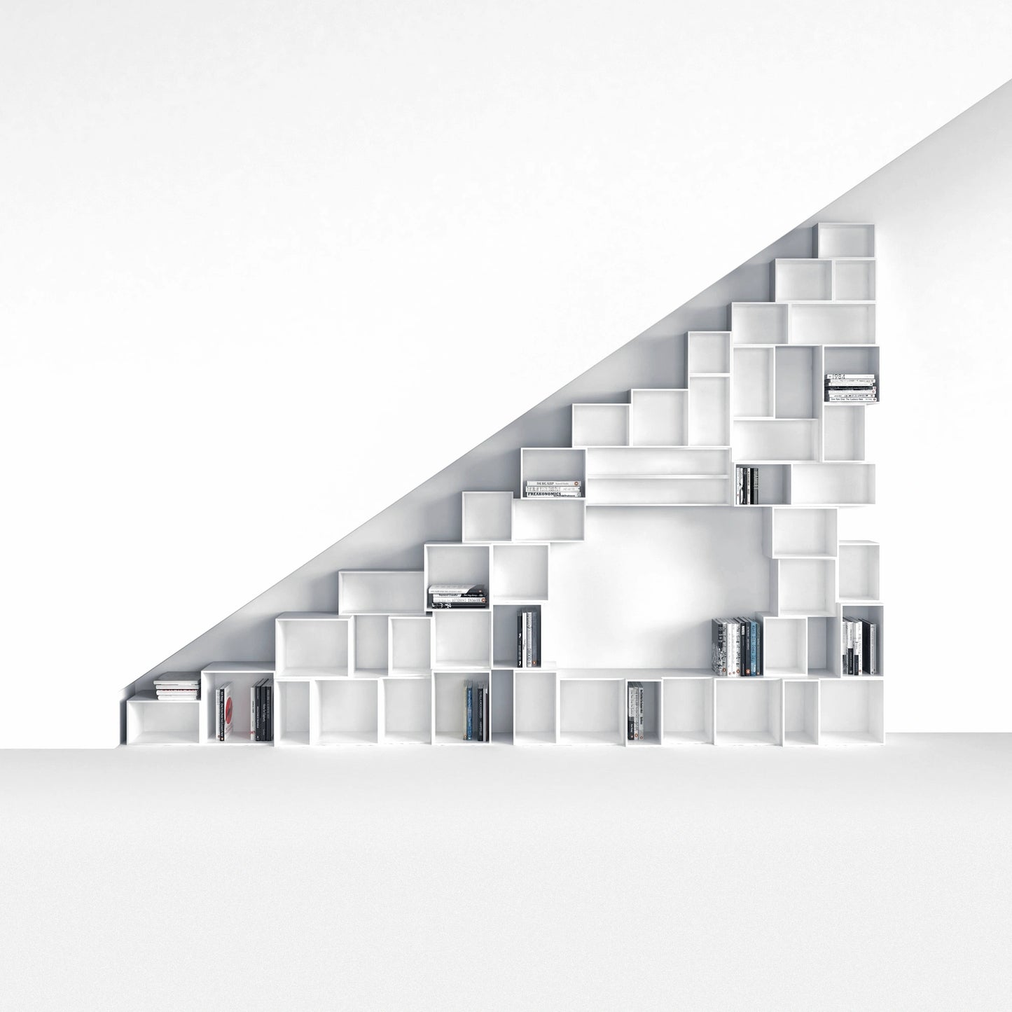 Les modules d'étagères s'orientent vers les formats courants de littérature et de musique, par exemple Din A4, A5, classeurs, atlas, livres d'images & disques. Cette grille de tailles provenant du contenu permet d'obtenir un look sculptural unique.