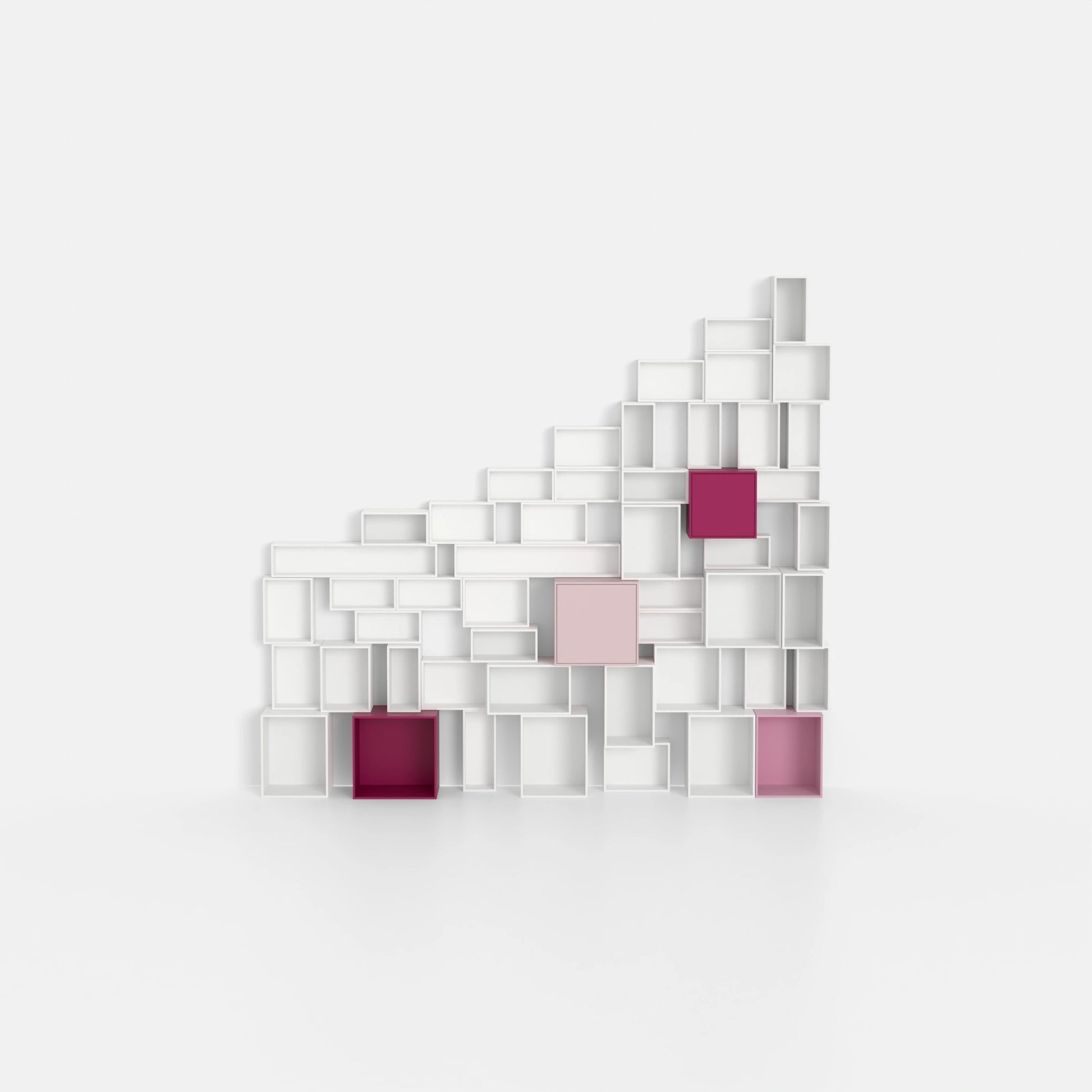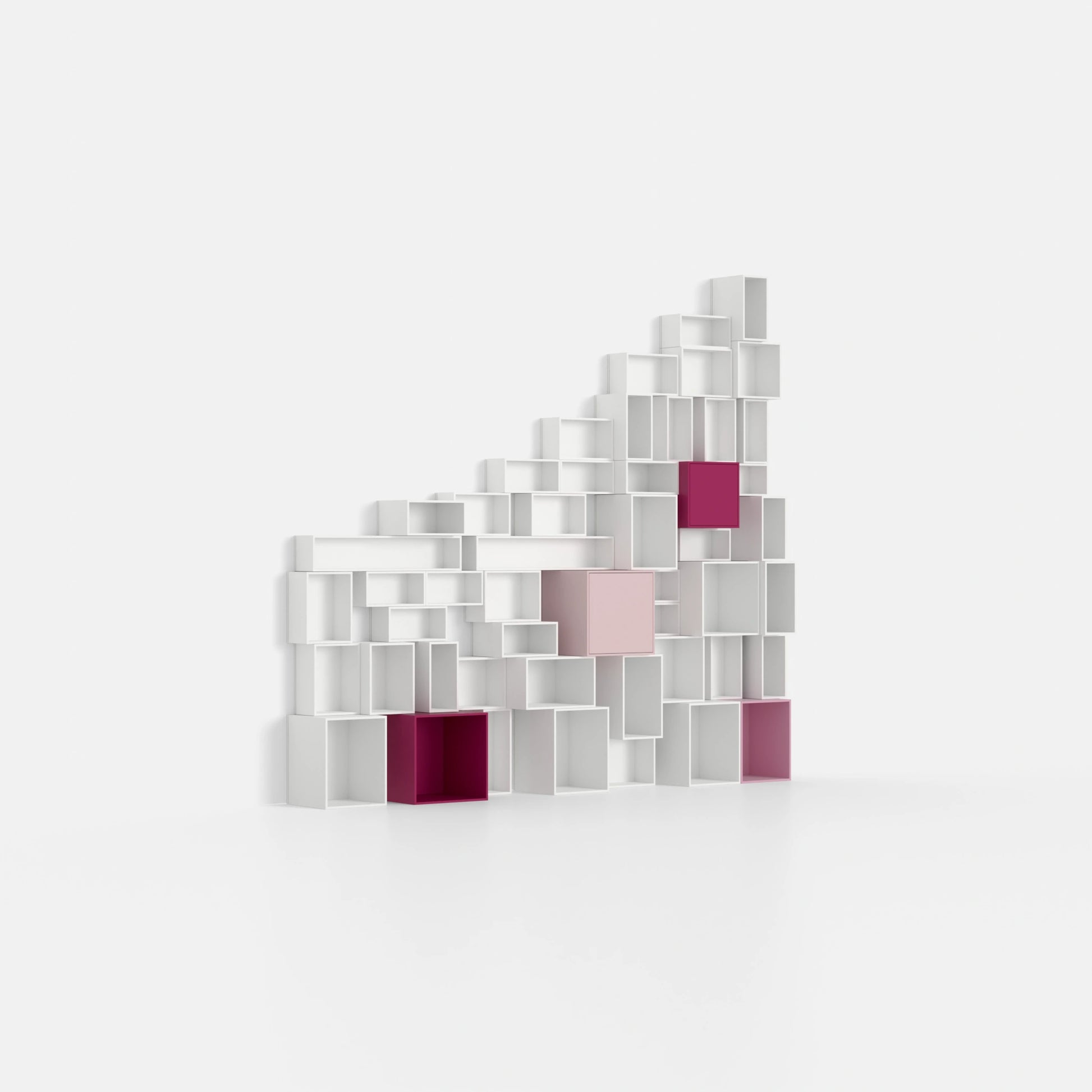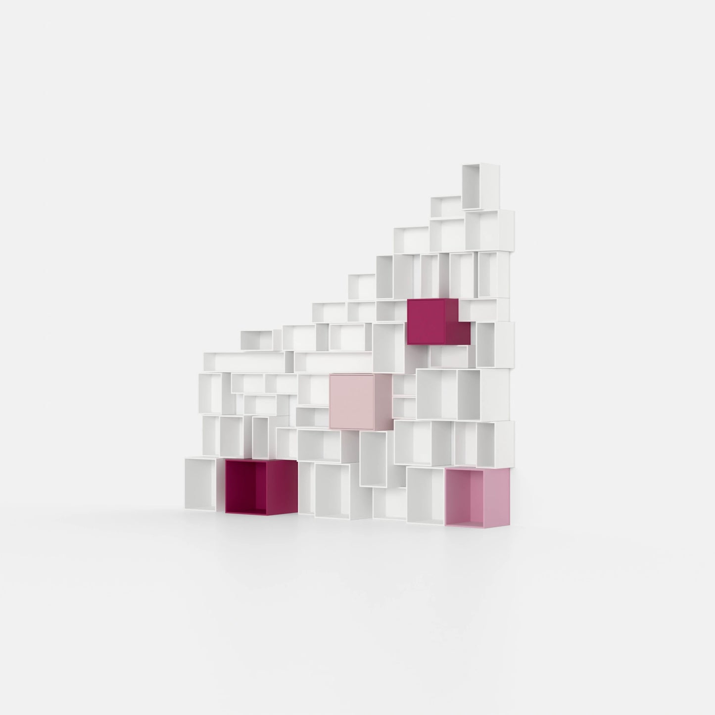 Les modules d'étagères s'orientent vers les formats courants de littérature et de musique, par exemple Din A4, A5, classeurs, atlas, livres d'images & disques. Cette grille de tailles provenant du contenu permet d'obtenir un look sculptural unique.