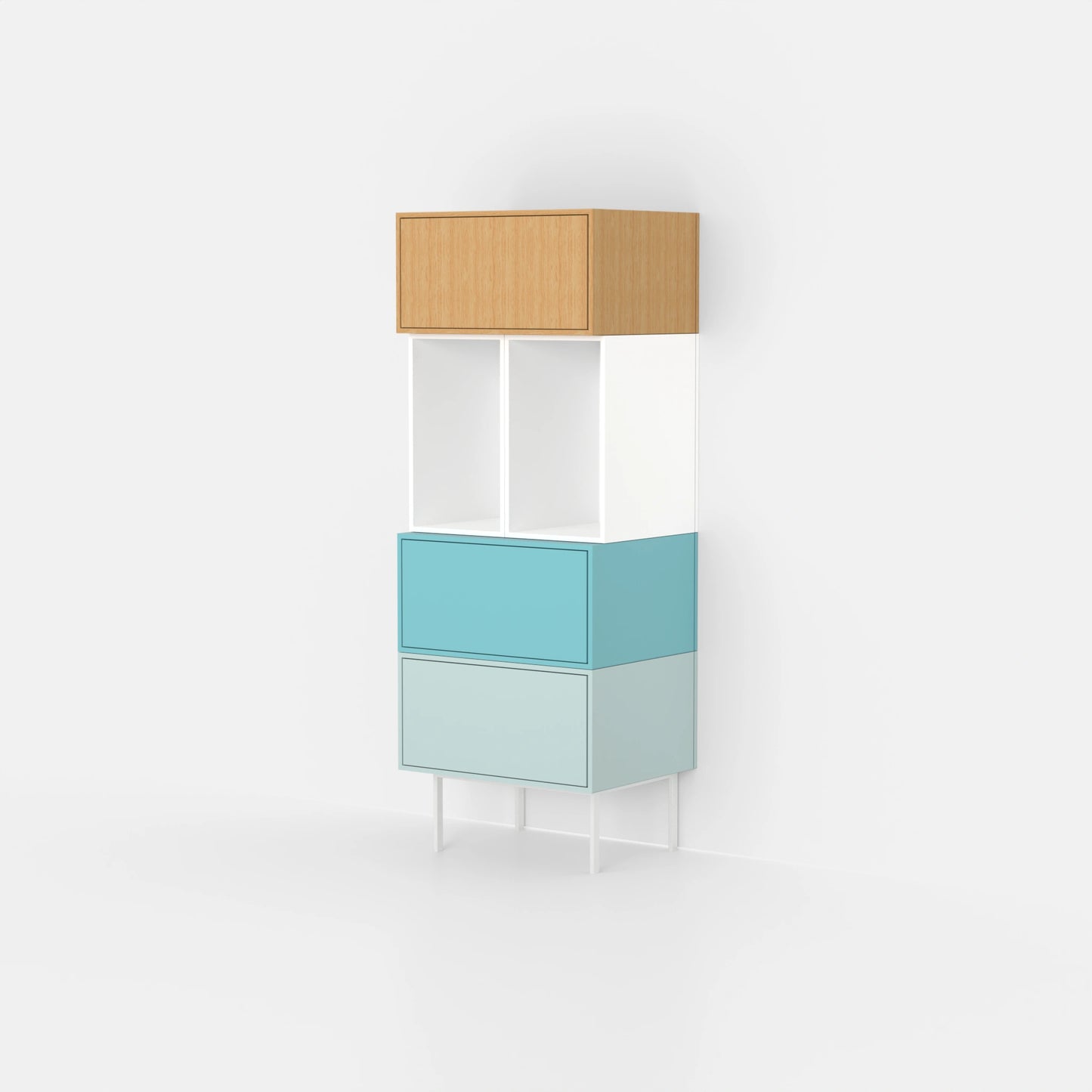 Vous pouvez obtenir L'étagère en blanc, lagon, lagon clair et bois chêne ambré . Chaque option de couleur s'adapte parfaitement aux différents styles d'aménagement. Le chêne ambré bois chêne ambré confère une atmosphère chaleureuse à votre pièce.