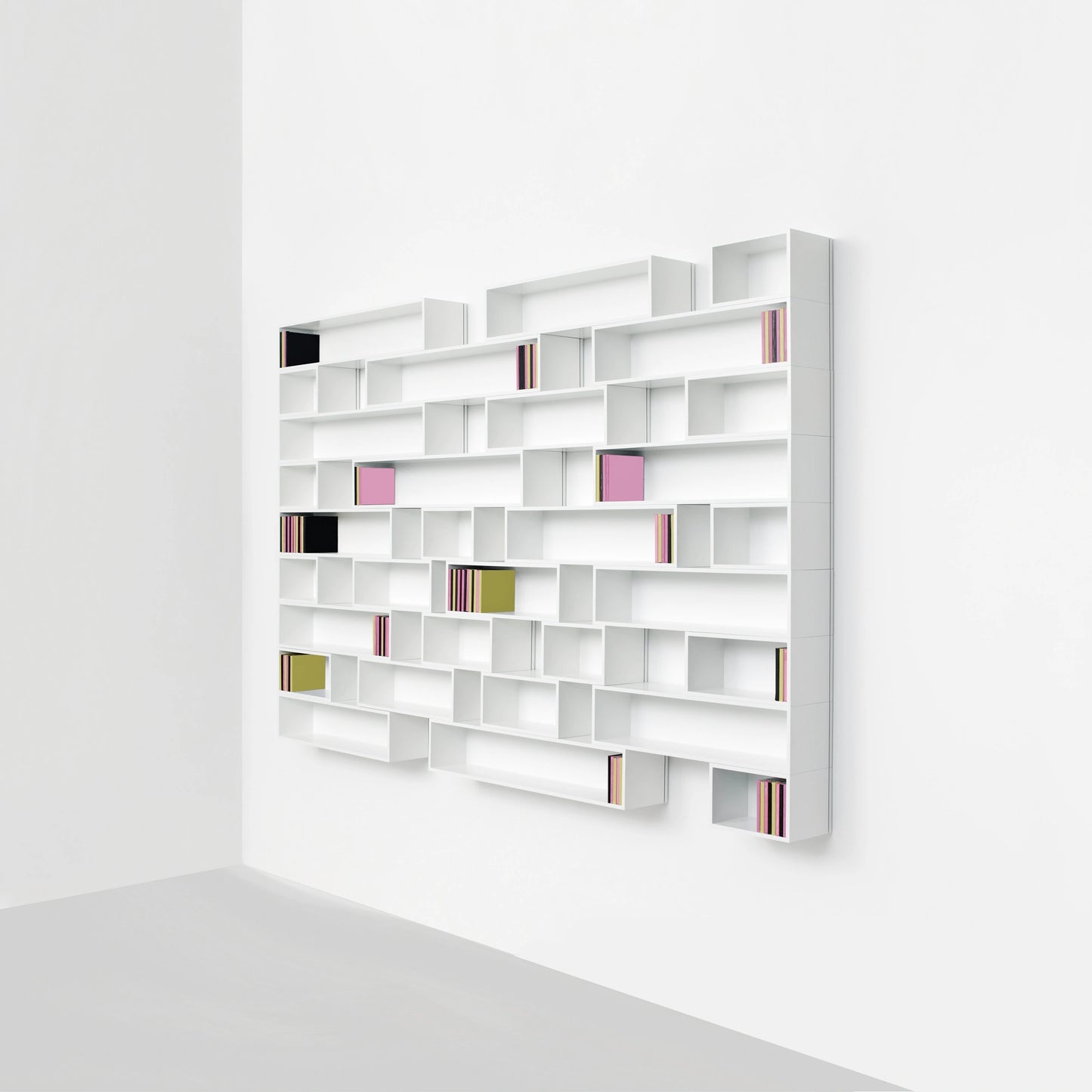 Die Regalmodule orientieren sich an den gängigen Literatur- und Musikformaten, z.B. Din A4, A5, Aktenordnern, Atlanten, Bildbänden & Schallplatten. Dieses vom Inhalt kommende Größen-Raster ermöglicht einen einzigartigen skulpturalen Look.