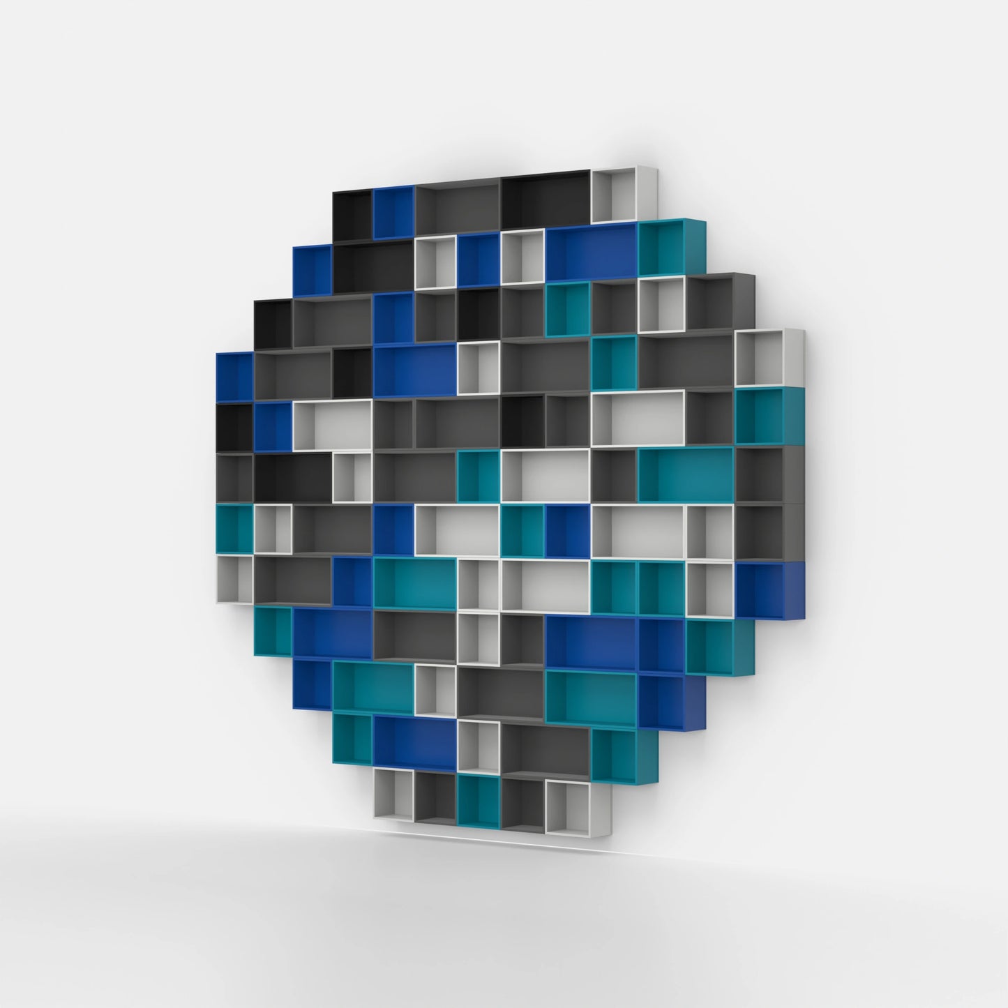 Die Regalmodule orientieren sich an den gängigen Literatur- und Musikformaten, z.B. Din A4, A5, Aktenordnern, Atlanten, Bildbänden & Schallplatten. Dieses vom Inhalt kommende Größen-Raster ermöglicht einen einzigartigen skulpturalen Look.