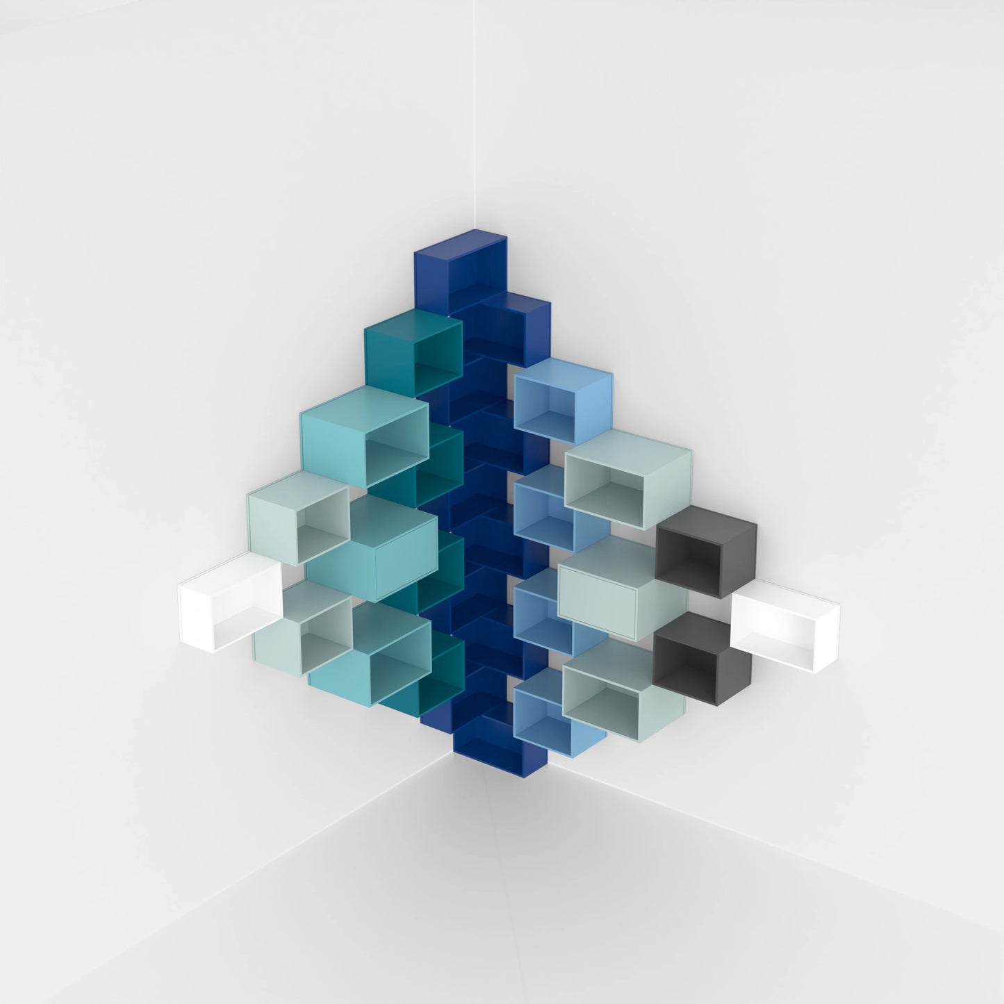 Cubit Regale in allen Farben des Regenbogens als Wandinstallation, geordnet in einem fließenden Farbverlauf – Ausdruck maximaler Farbvielfalt und Gestaltungsfreiheit