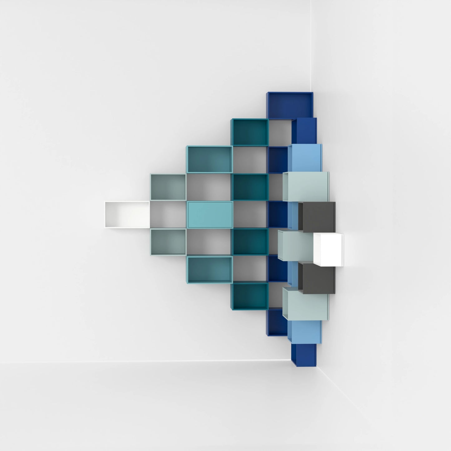 Cubit Regalwand aus farbigen Modulen in Rot-, Rosa- und Gelbtönen, dynamisch angeordnet für ein lebendiges Raumdesign
