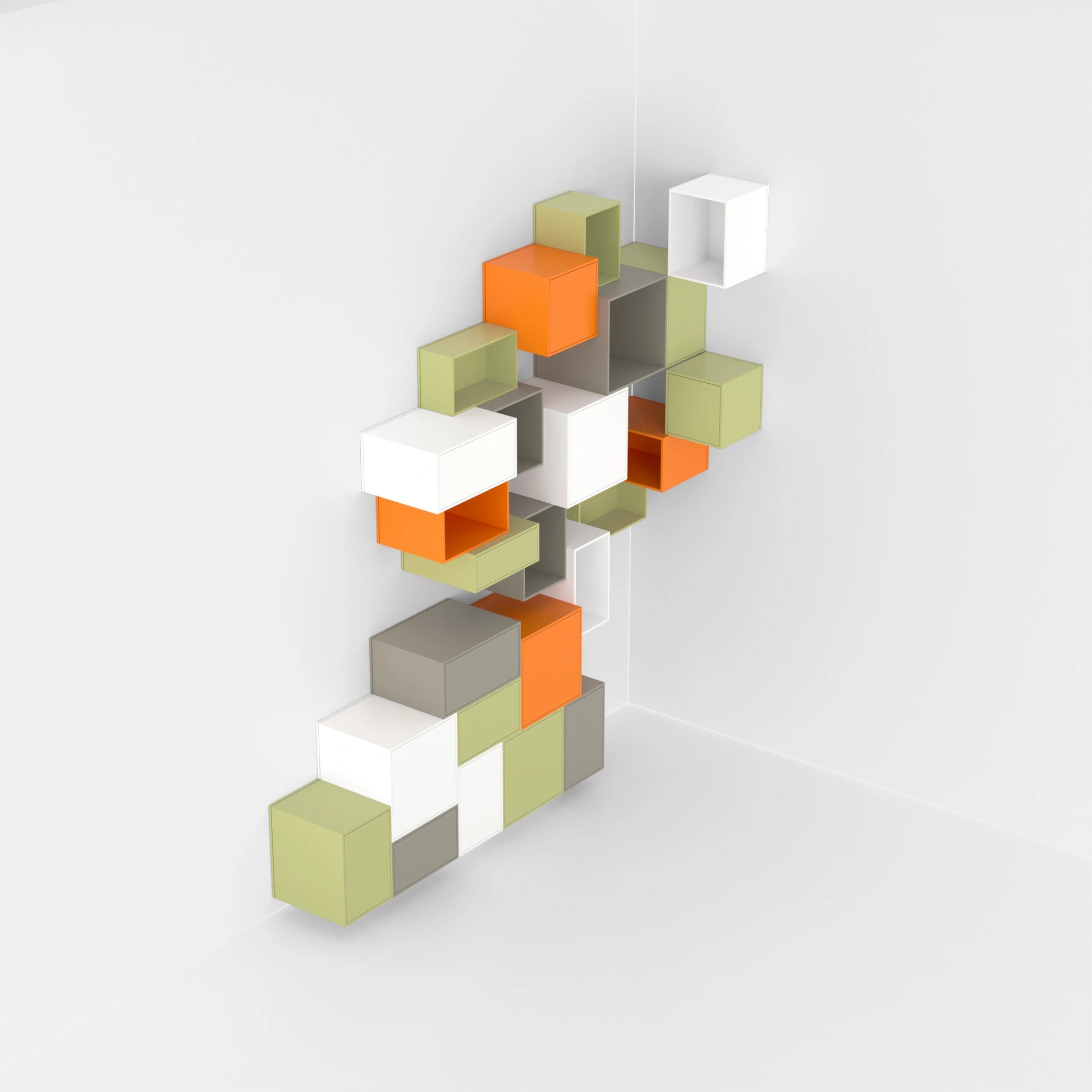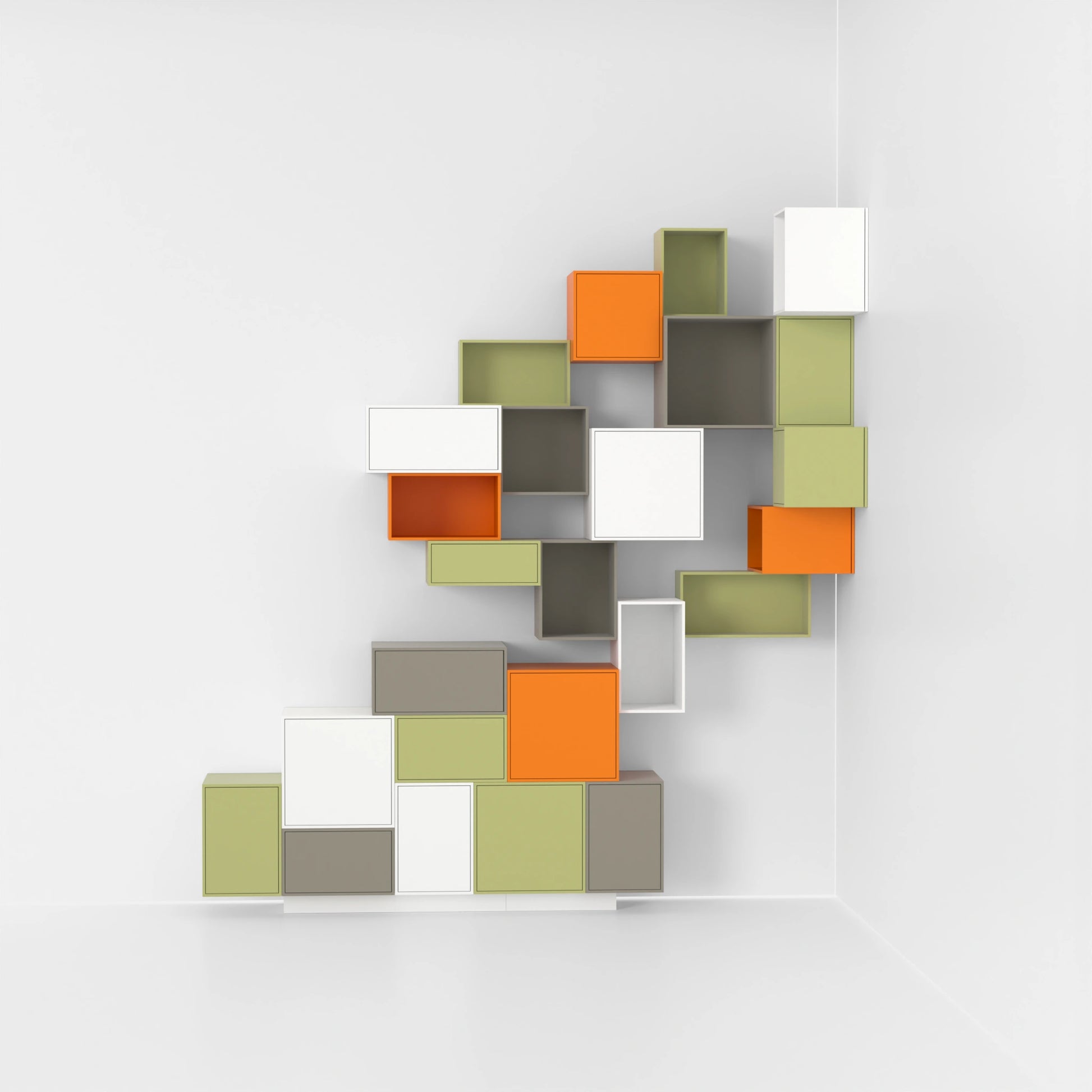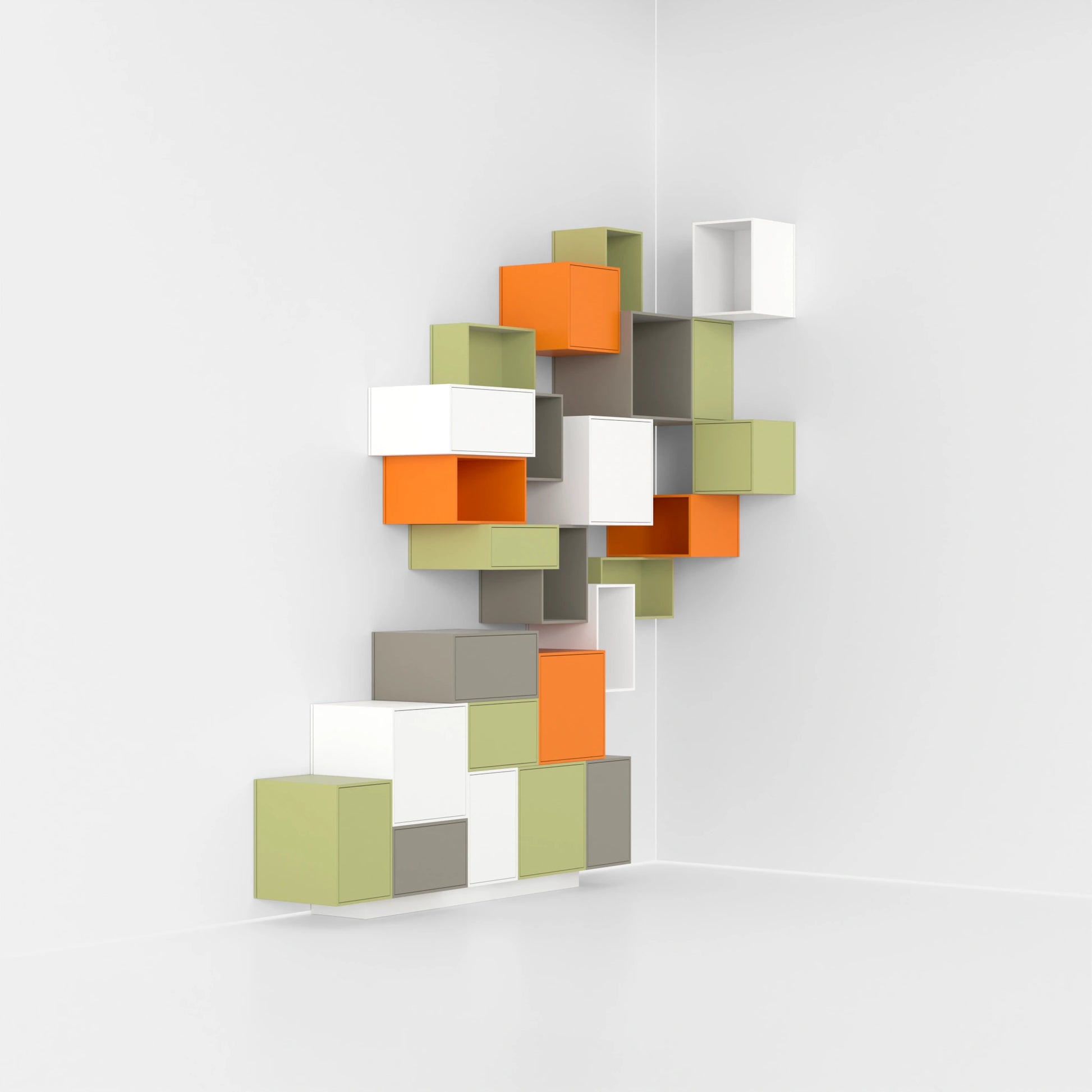 Cubit Regalwand aus farbigen Modulen in Rot-, Rosa- und Gelbtönen, dynamisch angeordnet für ein lebendiges Raumdesign