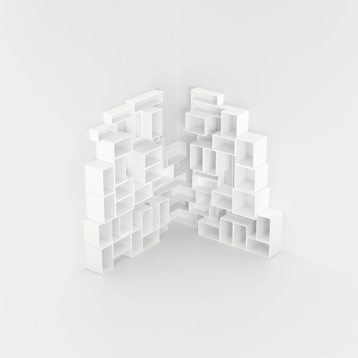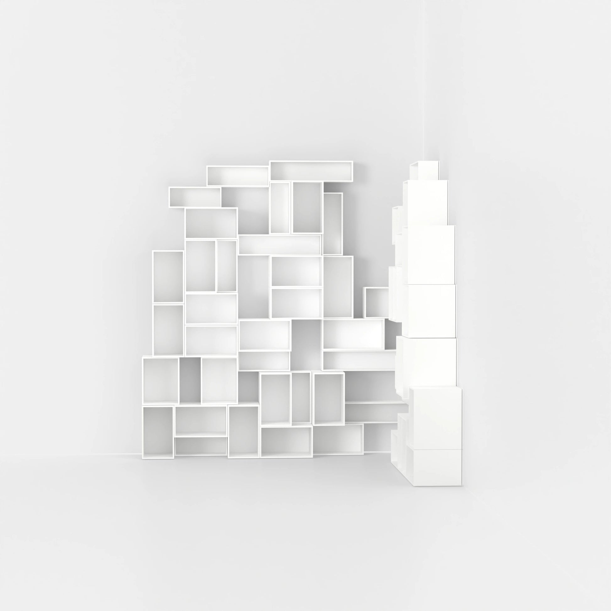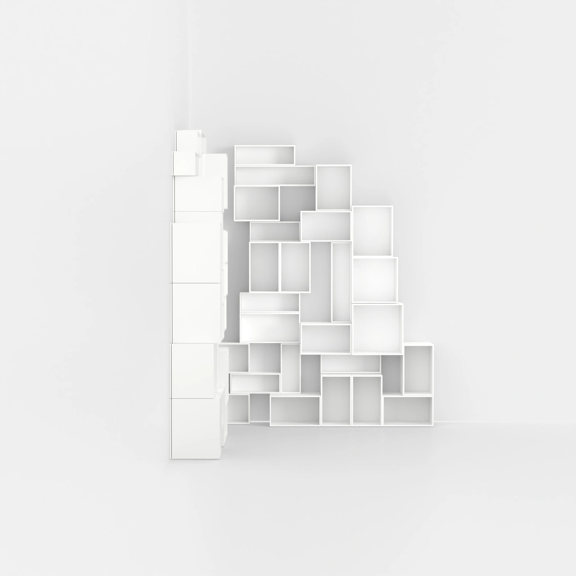 Die Regalmodule orientieren sich an den gängigen Literatur- und Musikformaten, z.B. Din A4, A5, Aktenordnern, Atlanten, Bildbänden & Schallplatten. Dieses vom Inhalt kommende Größen-Raster ermöglicht einen einzigartigen skulpturalen Look.