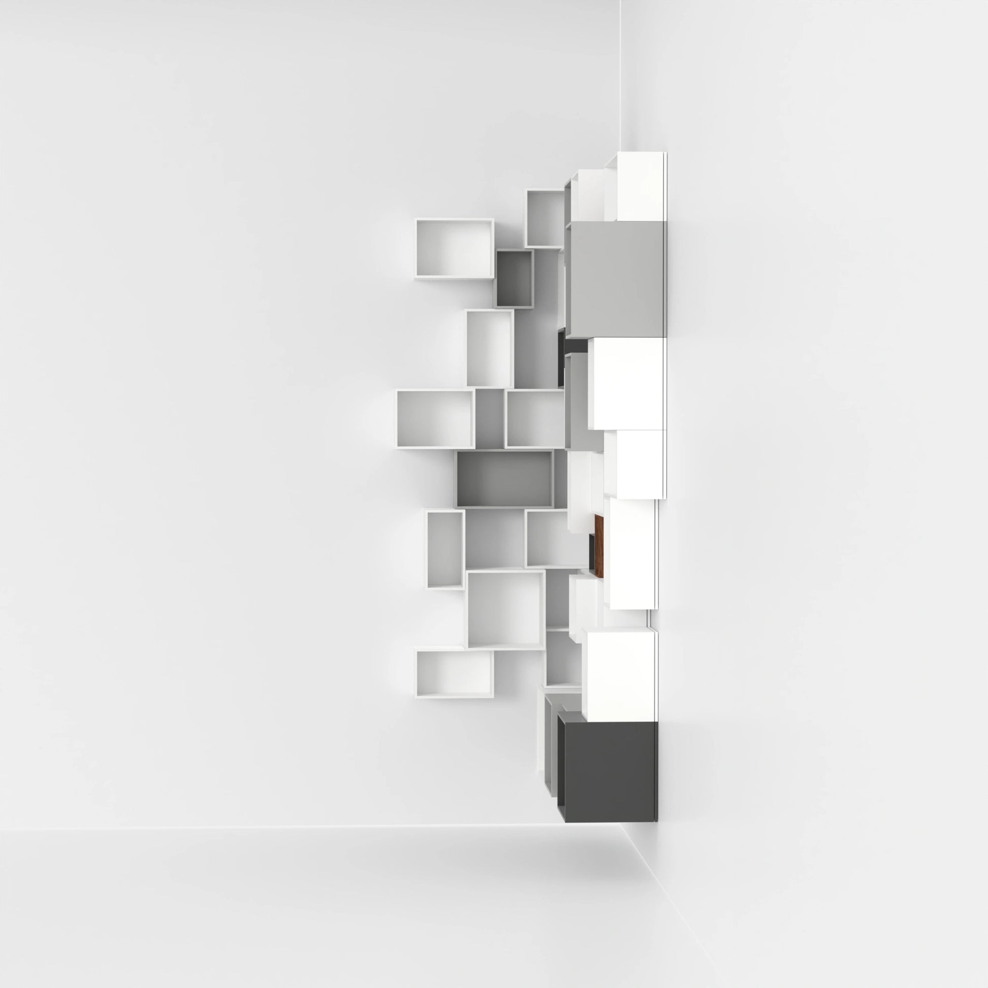 Die Regalmodule orientieren sich an den gängigen Literatur- und Musikformaten, z.B. Din A4, A5, Aktenordnern, Atlanten, Bildbänden & Schallplatten. Dieses vom Inhalt kommende Größen-Raster ermöglicht einen einzigartigen skulpturalen Look.