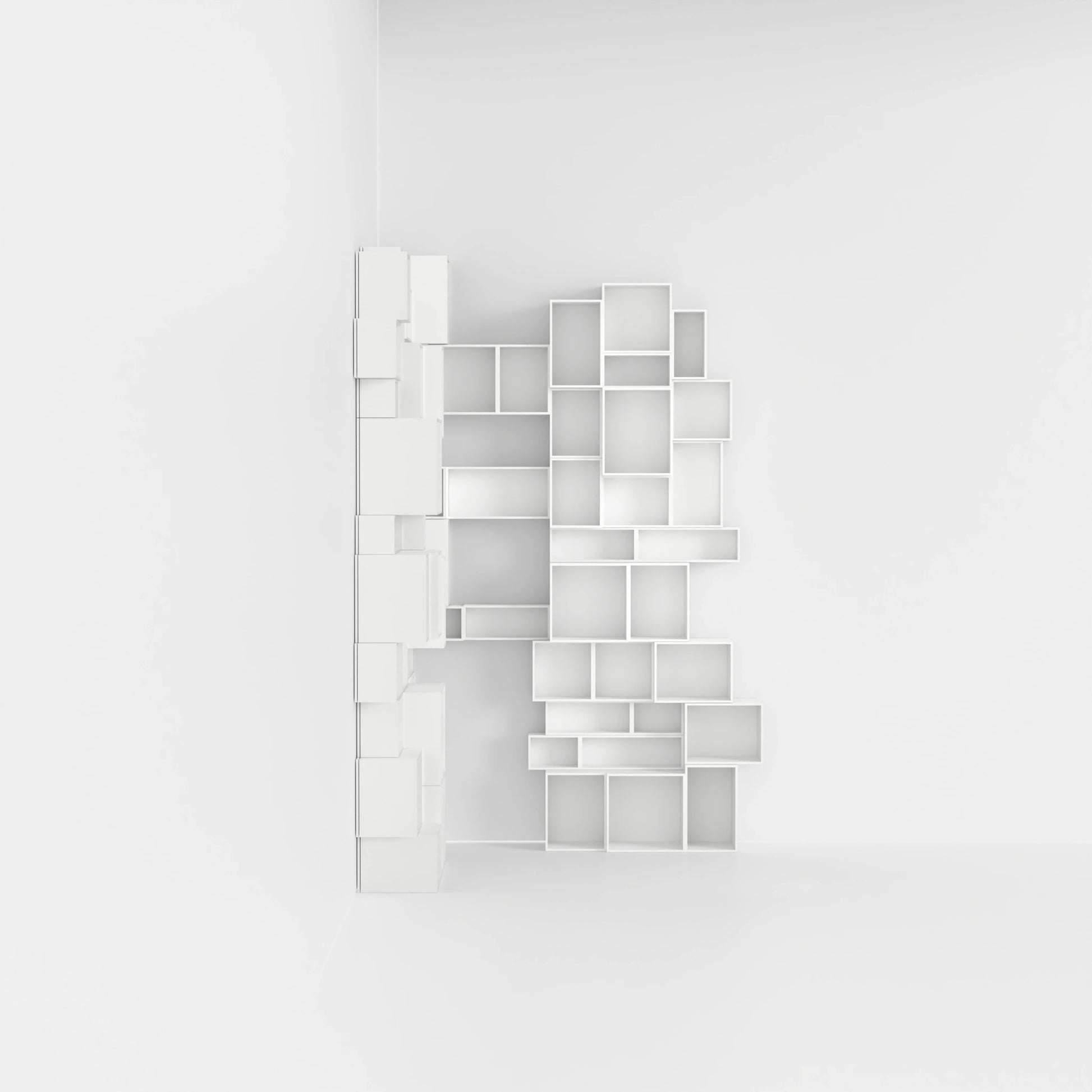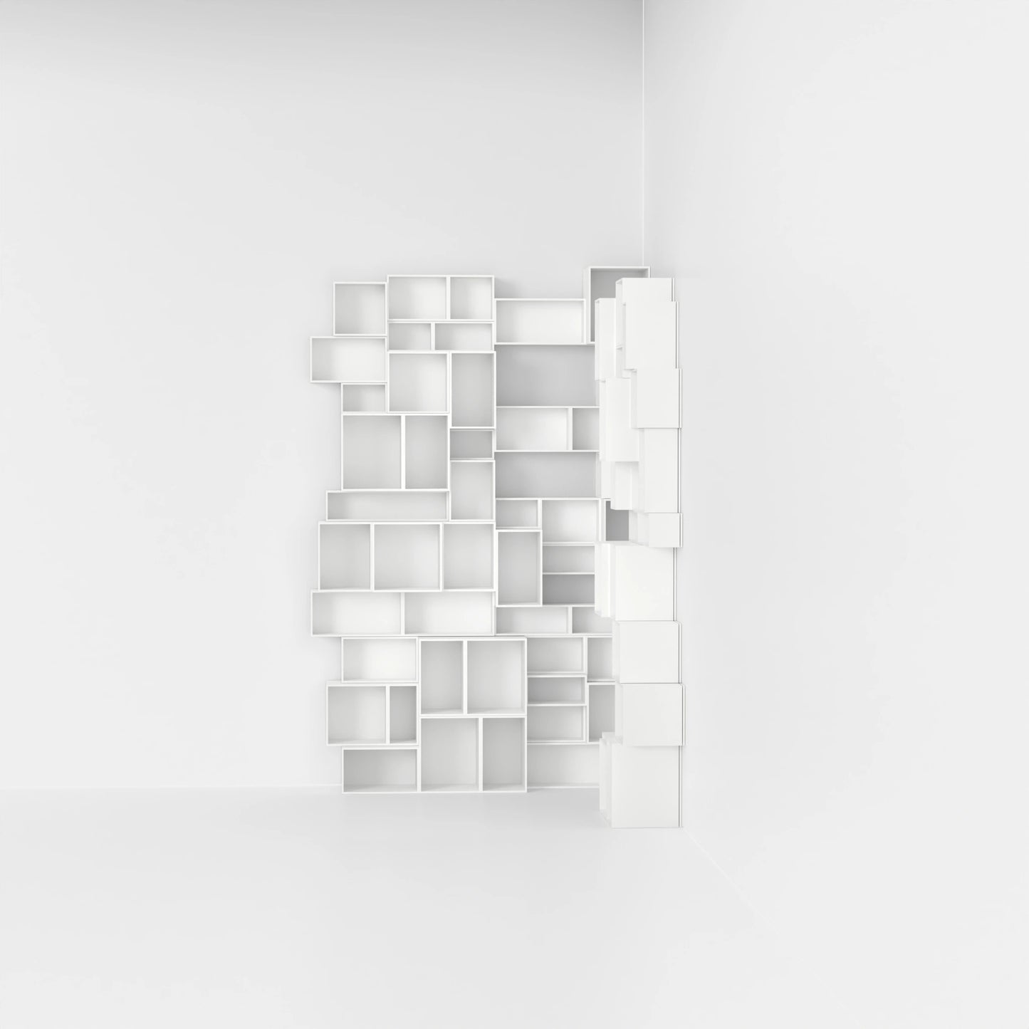 Die Regalmodule orientieren sich an den gängigen Literatur- und Musikformaten, z.B. Din A4, A5, Aktenordnern, Atlanten, Bildbänden & Schallplatten. Dieses vom Inhalt kommende Größen-Raster ermöglicht einen einzigartigen skulpturalen Look.