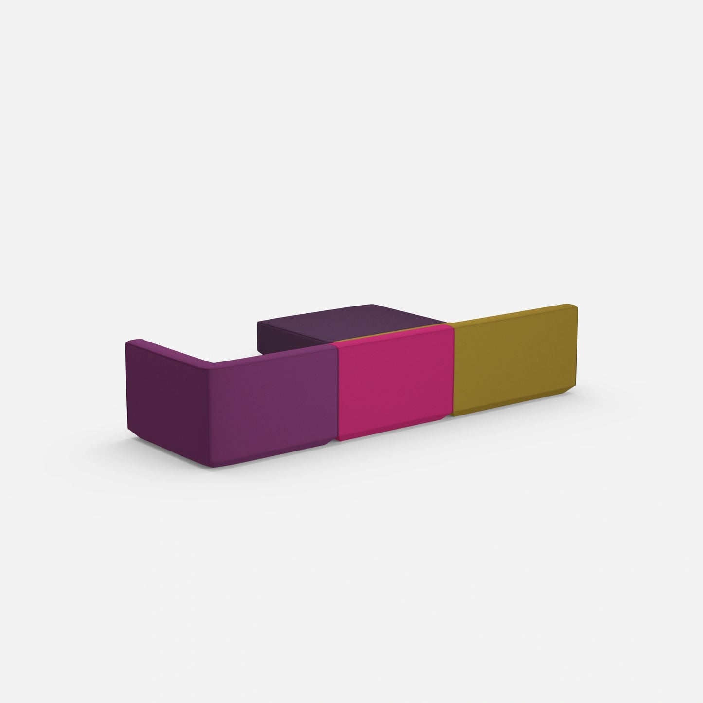 Verschieden konfigurierte Cubit Sofa Module in einem großen, offenen Raum – zeigt die Vielfalt an Kombinationsmöglichkeiten und Farben