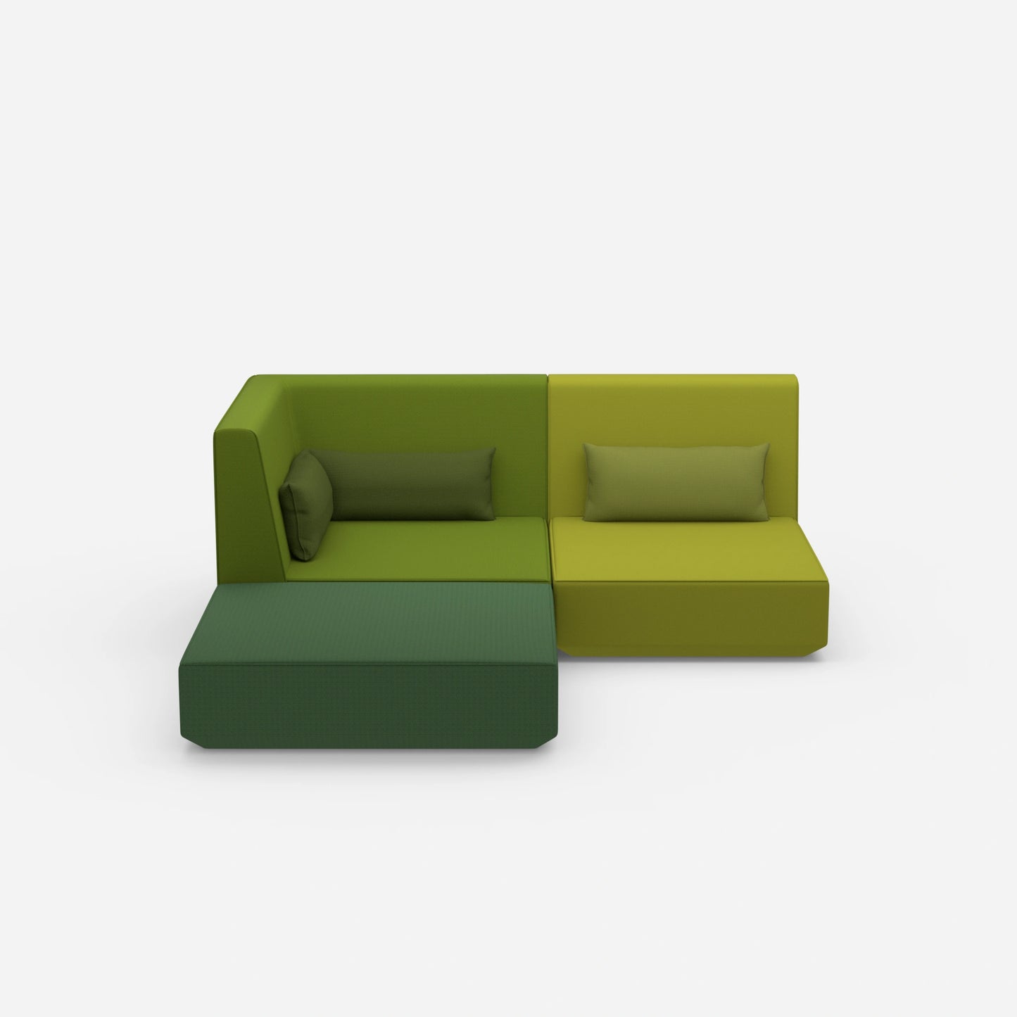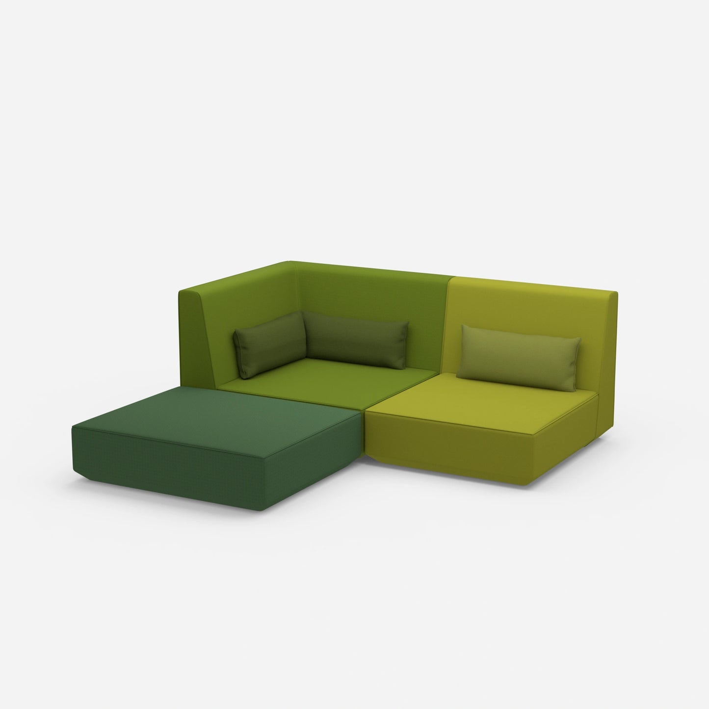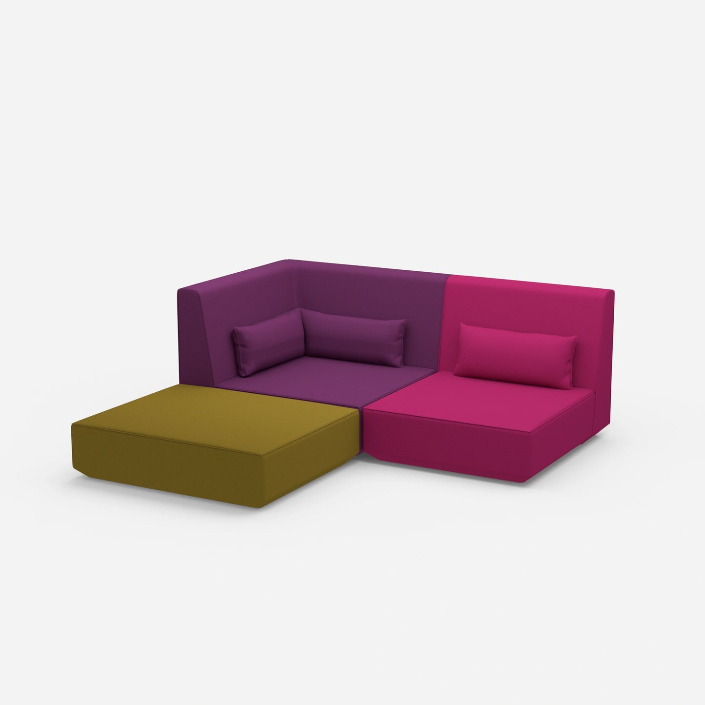 Verschieden konfigurierte Cubit Sofa Module in einem großen, offenen Raum – zeigt die Vielfalt an Kombinationsmöglichkeiten und Farben