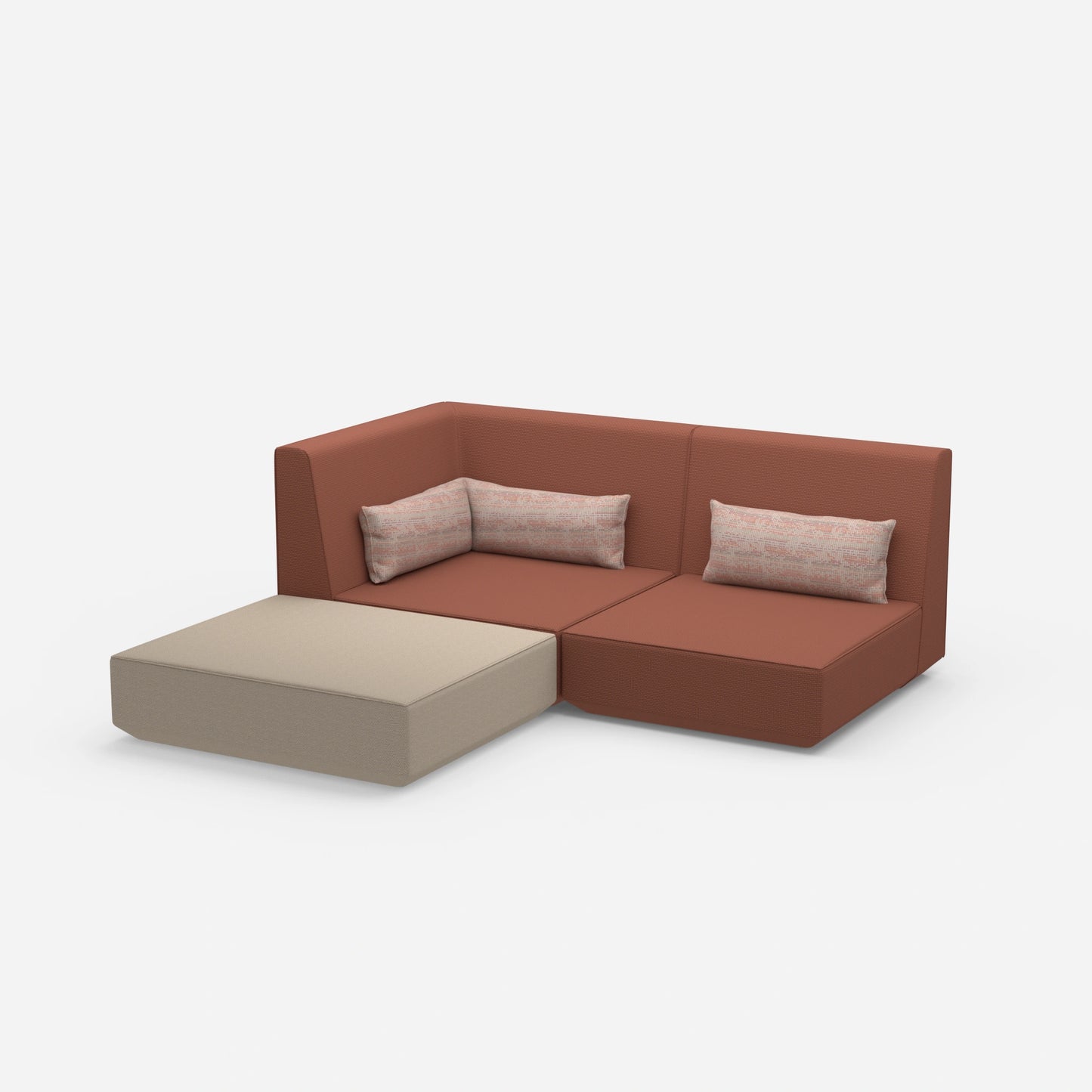 Zwei modulare Sofa-Elemente und ein Kissen mit aufgelegten Stoffmustern in einem hellen Raum, bereit zur Ansicht durch Kund:innen