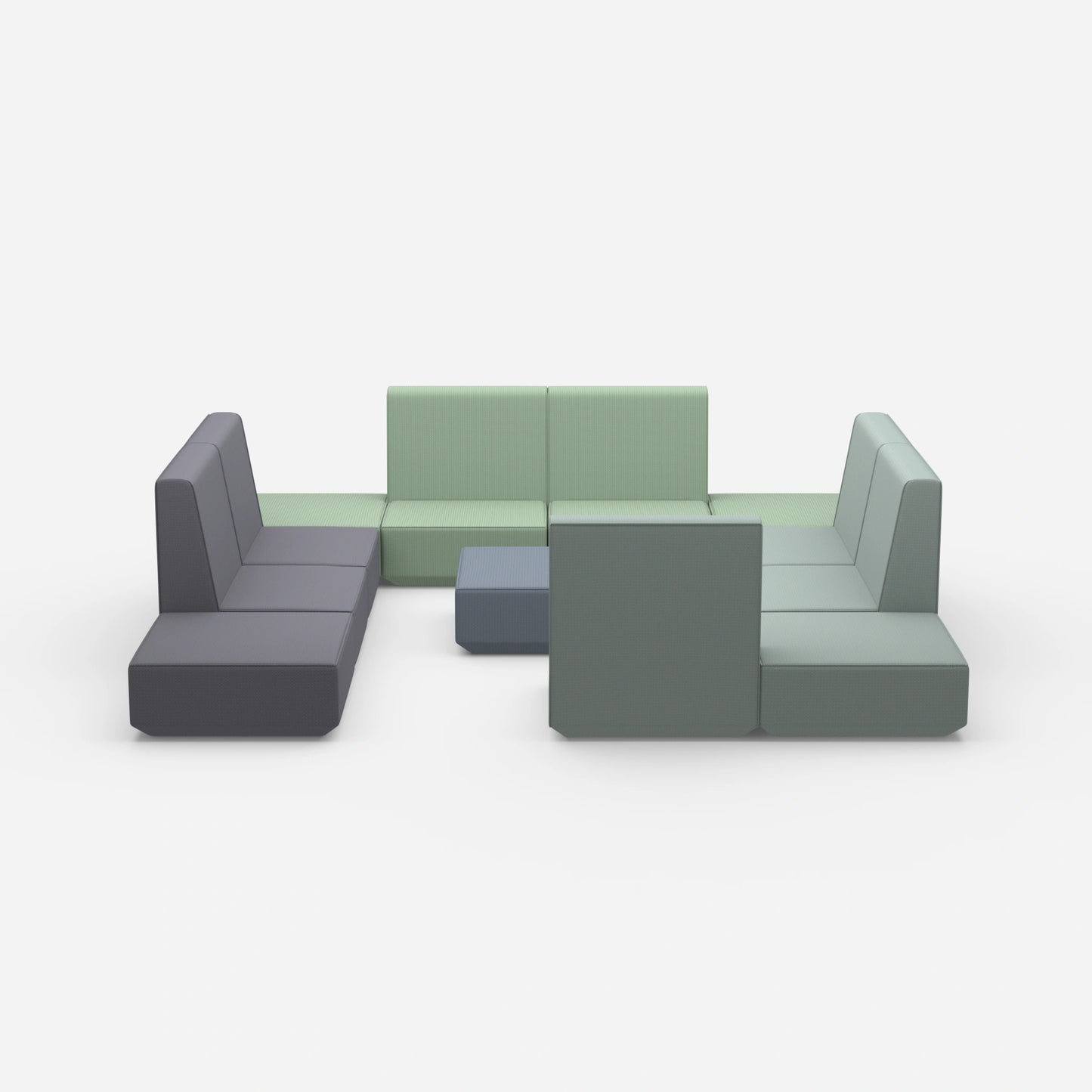 Verschieden konfigurierte Cubit Sofa Module in einem großen, offenen Raum – zeigt die Vielfalt an Kombinationsmöglichkeiten und Farben