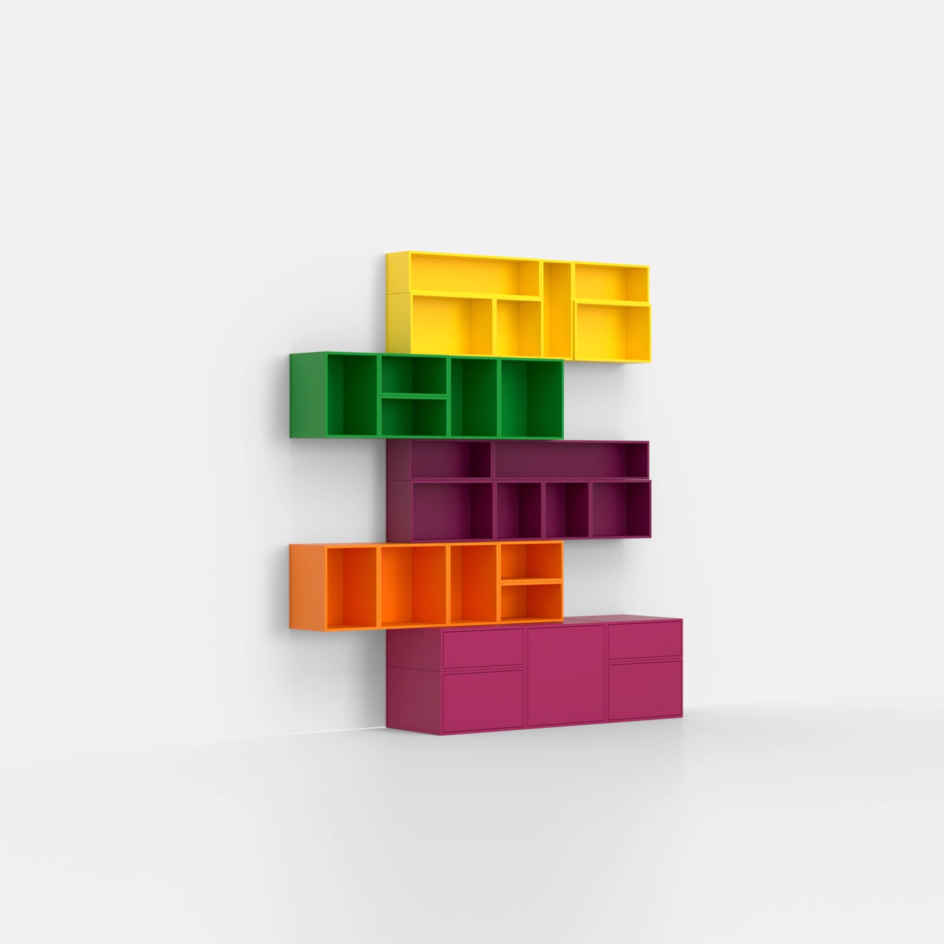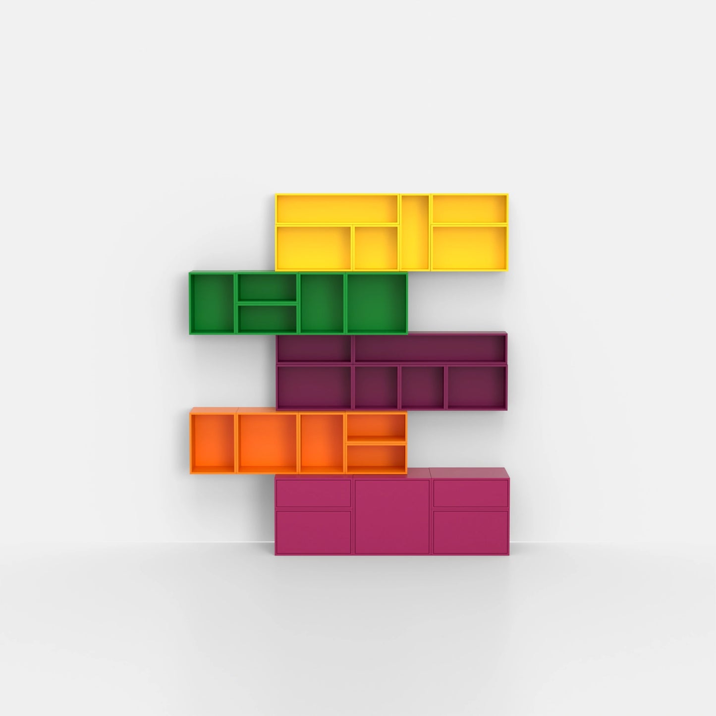 Cubit Regalwand aus farbigen Modulen in Rot-, Rosa- und Gelbtönen, dynamisch angeordnet für ein lebendiges Raumdesign