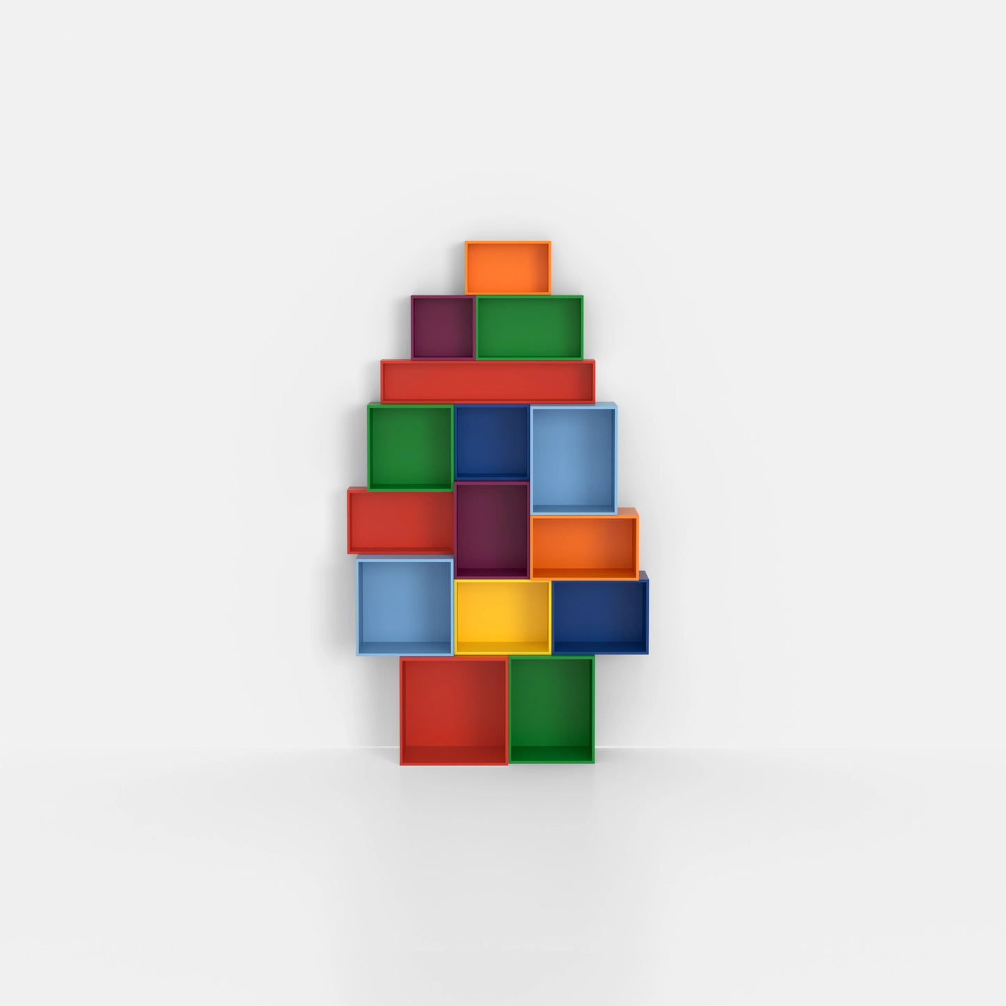 Cubit Regalwand aus farbigen Modulen in Rot-, Rosa- und Gelbtönen, dynamisch angeordnet für ein lebendiges Raumdesign