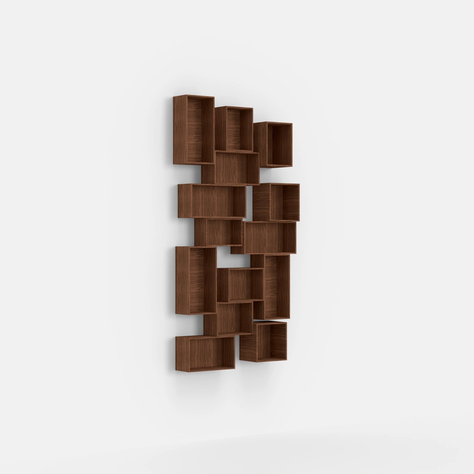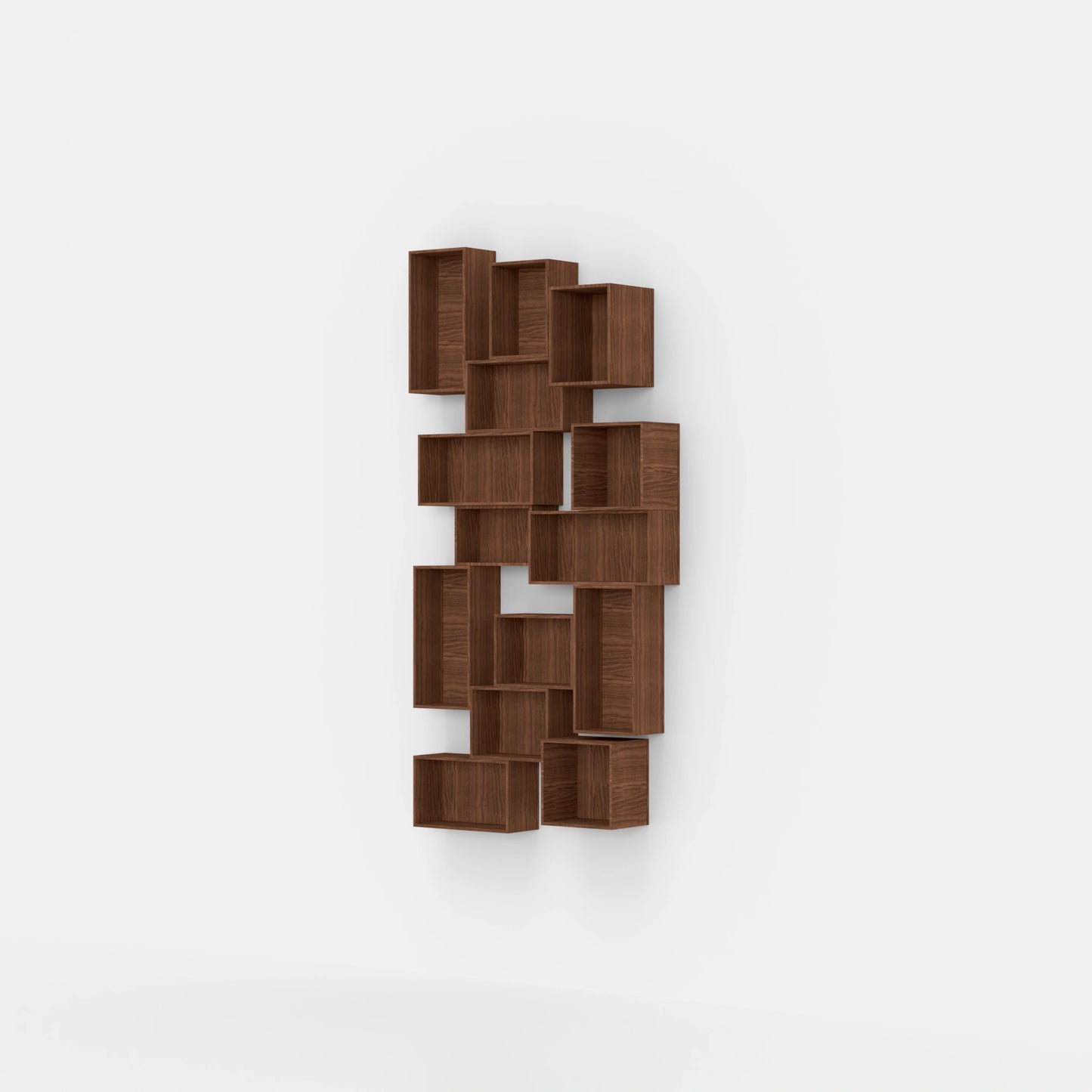 Die Regalmodule orientieren sich an den gängigen Literatur- und Musikformaten, z.B. Din A4, A5, Aktenordnern, Atlanten, Bildbänden & Schallplatten. Dieses vom Inhalt kommende Größen-Raster ermöglicht einen einzigartigen skulpturalen Look.