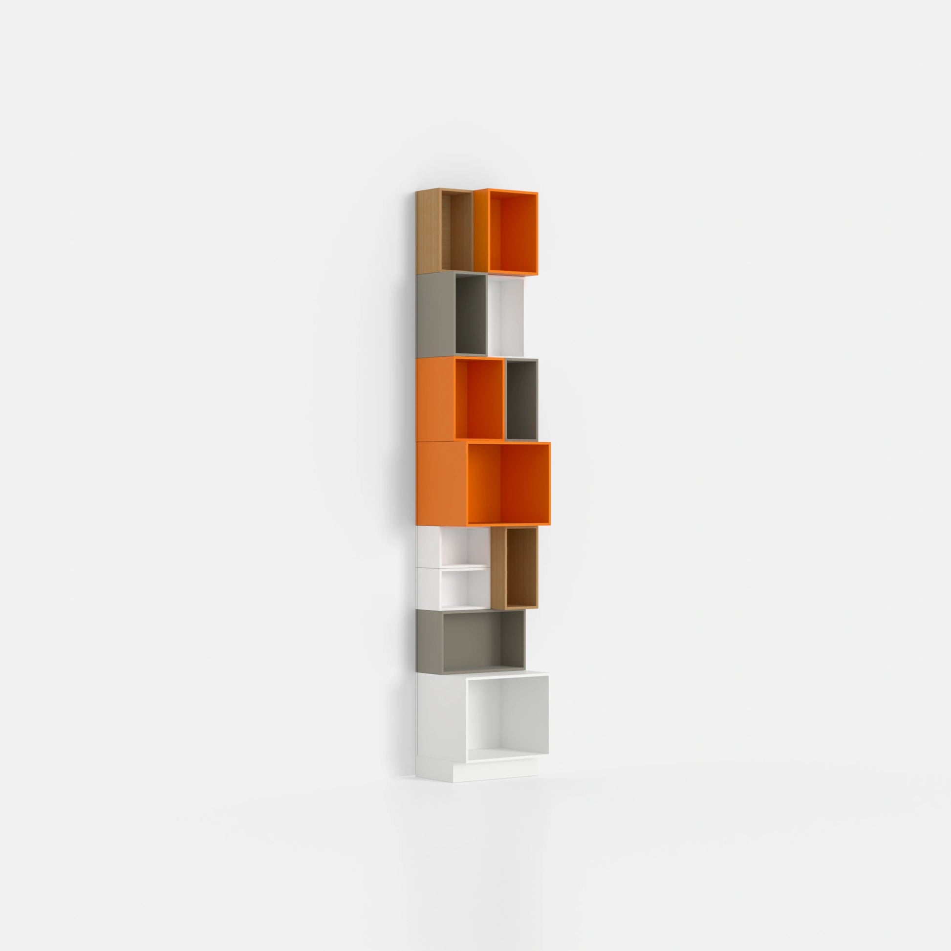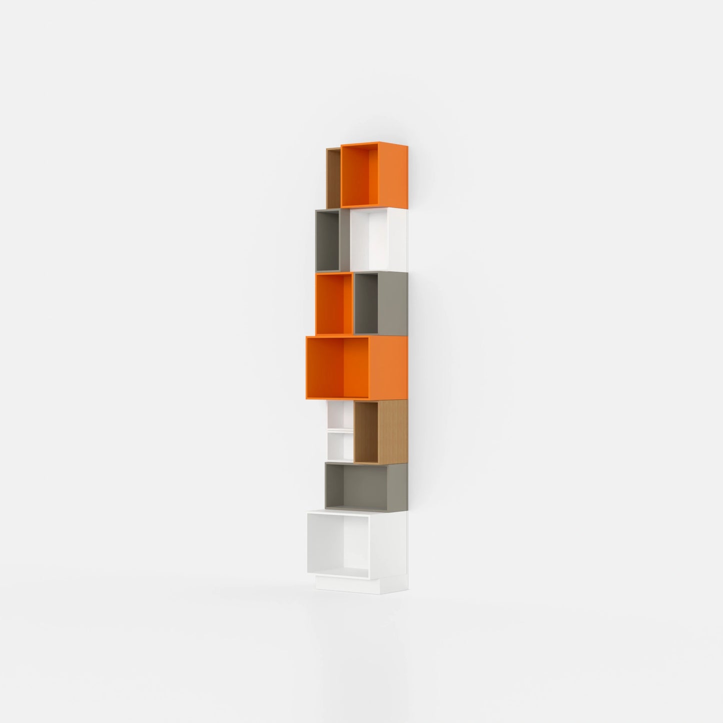 Die Regalmodule orientieren sich an den gängigen Literatur- und Musikformaten, z.B. Din A4, A5, Aktenordnern, Atlanten, Bildbänden & Schallplatten. Dieses vom Inhalt kommende Größen-Raster ermöglicht einen einzigartigen skulpturalen Look.