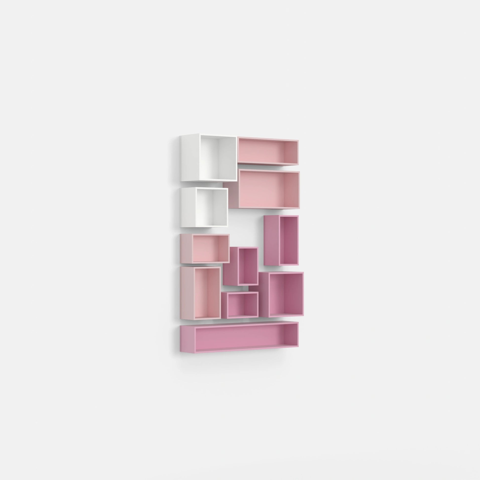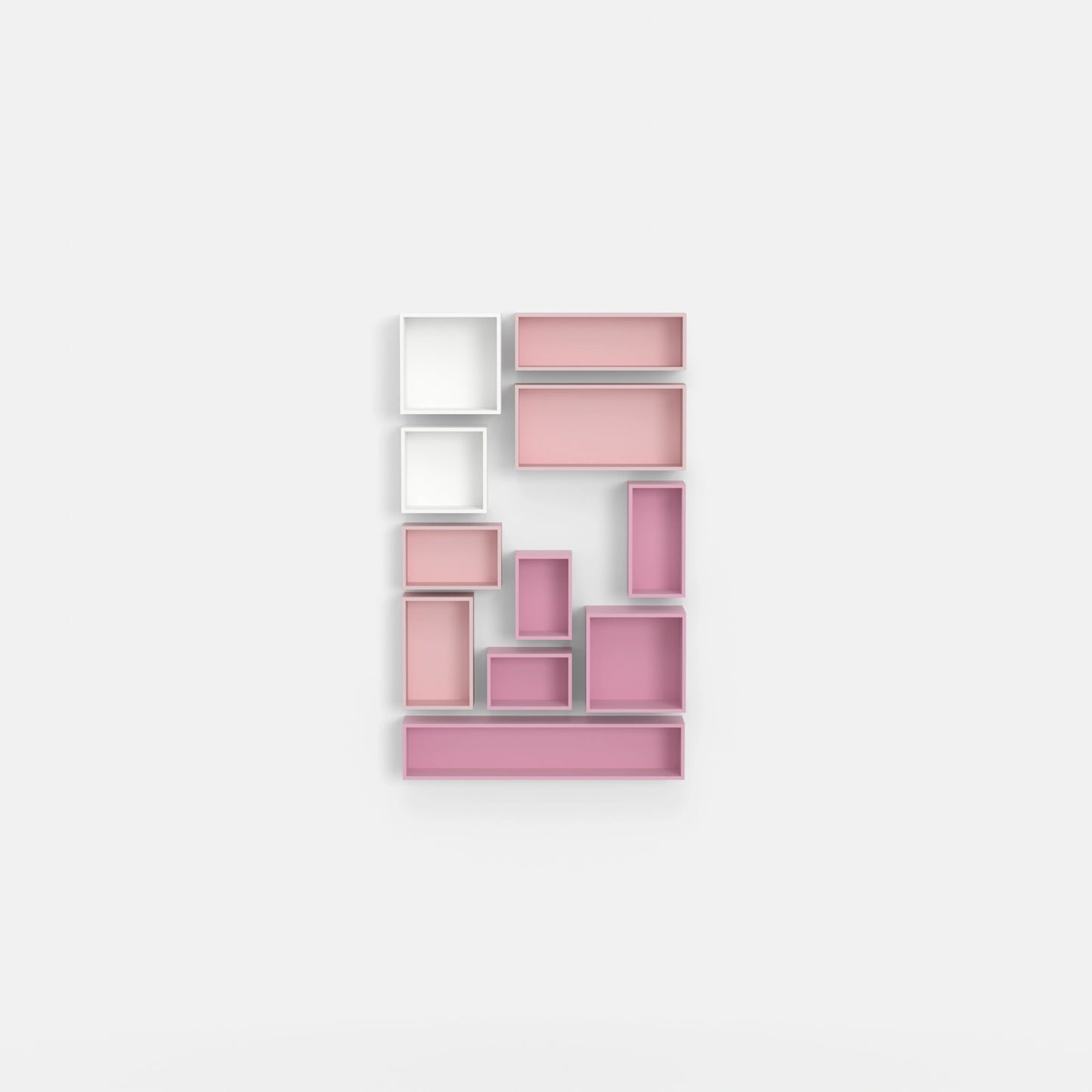 Cubit Regalwand aus farbigen Modulen in Rot-, Rosa- und Gelbtönen, dynamisch angeordnet für ein lebendiges Raumdesign