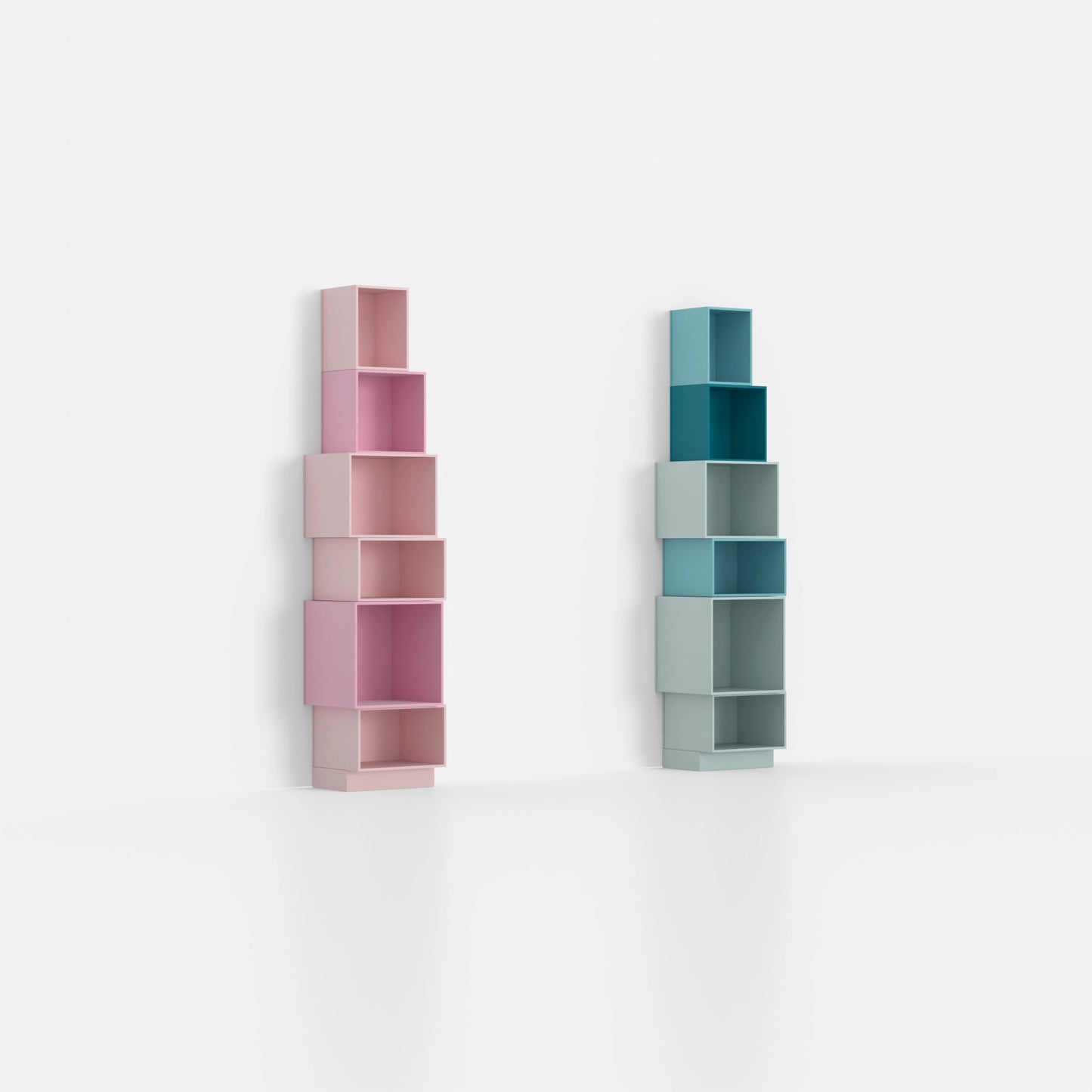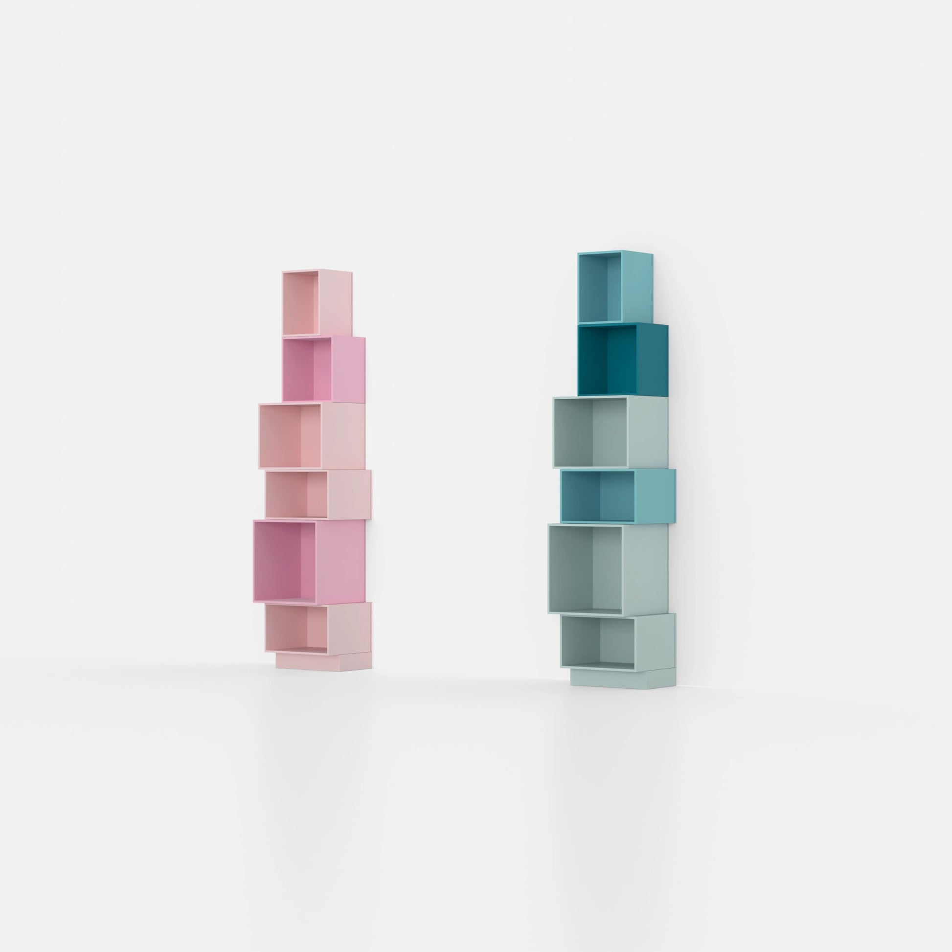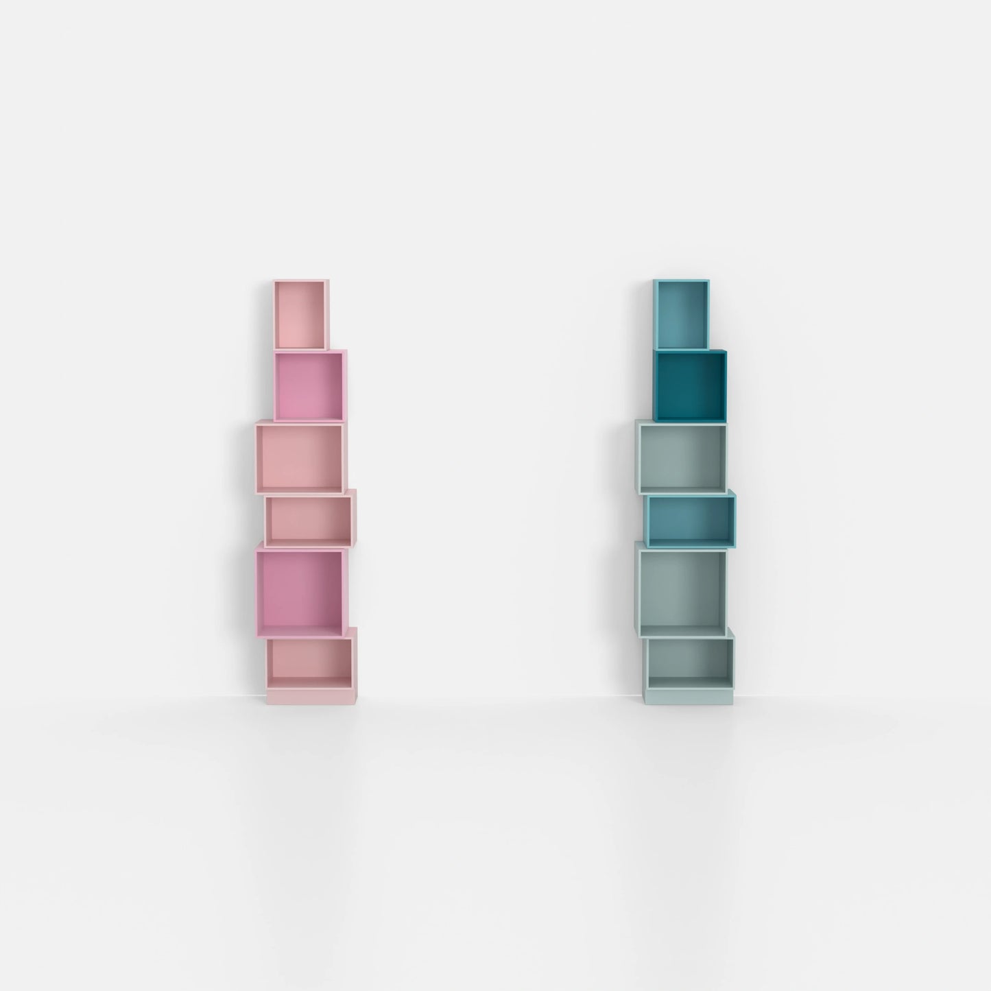 Cubit Regalwand aus farbigen Modulen in Rot-, Rosa- und Gelbtönen, dynamisch angeordnet für ein lebendiges Raumdesign