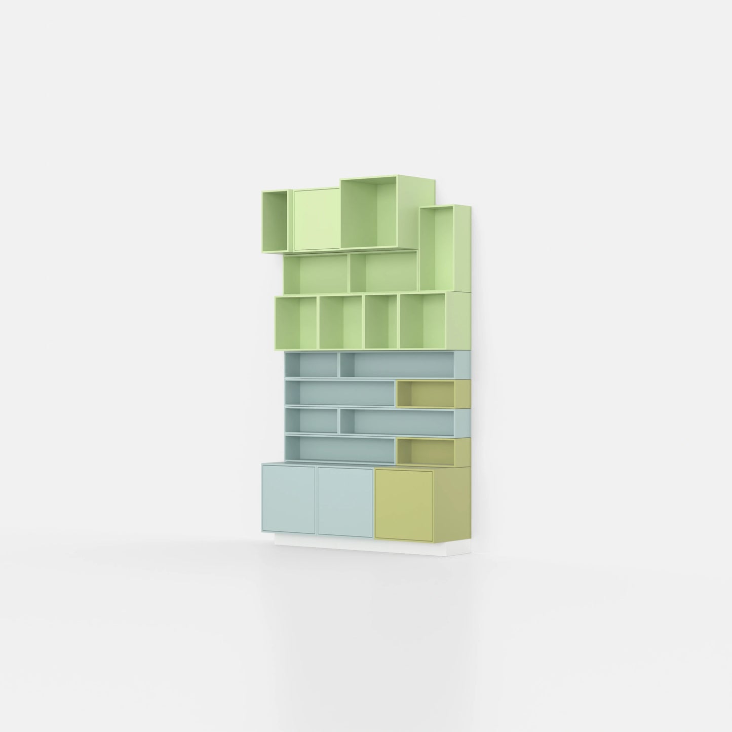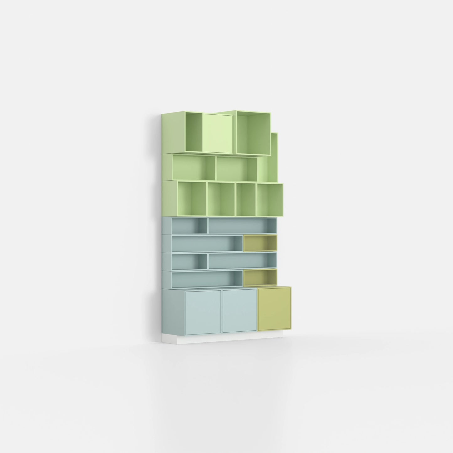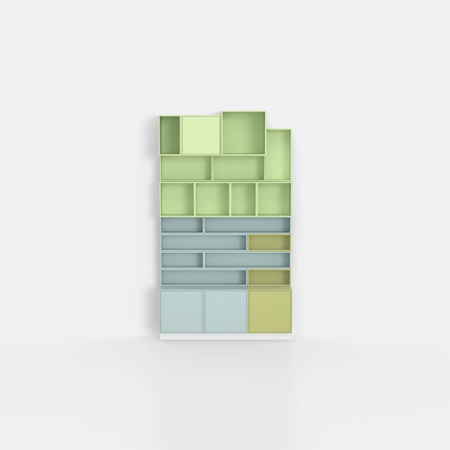 23 Module bieten Platz für Bücher, Dekoration und Alltagsgegenstände. Alles hat seinen Platz. Effiziente Raumnutzung wird einfach. Modularität bedeutet Anpassungsfähigkeit - je nach Raumhöhe und Bedarf.