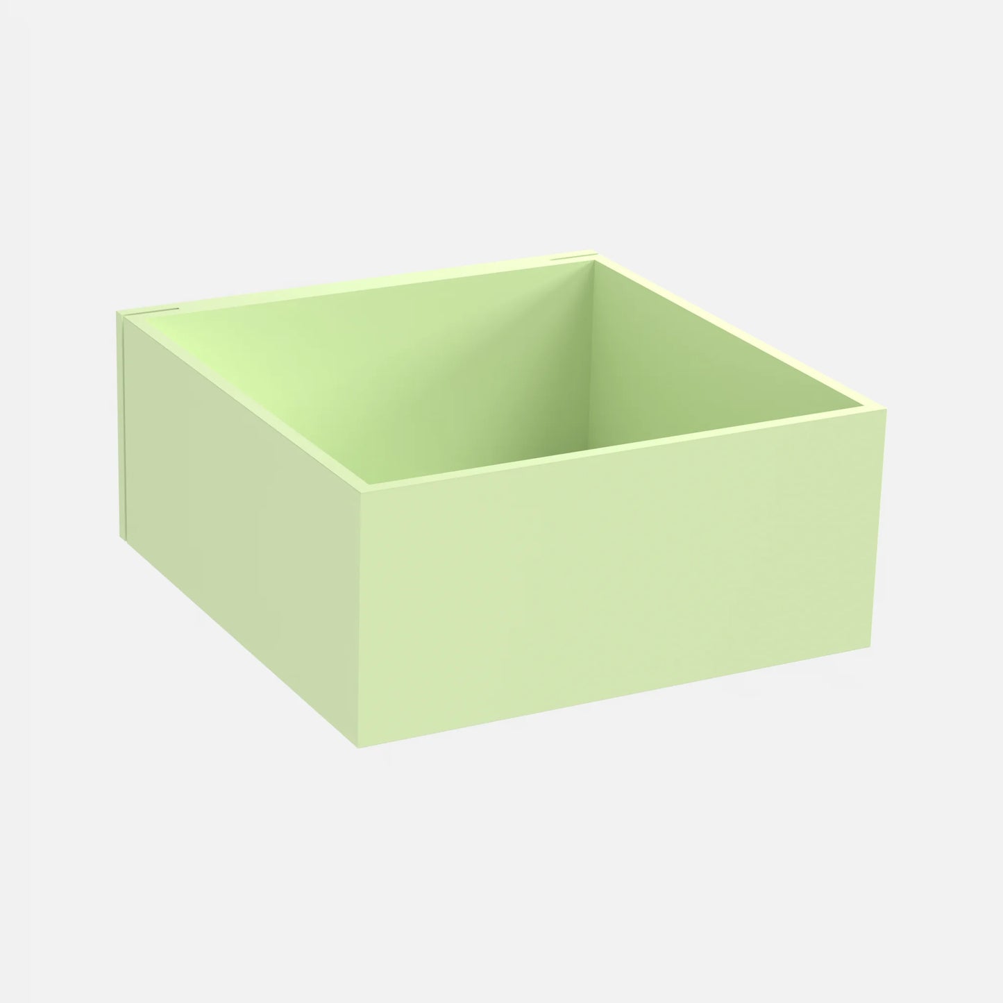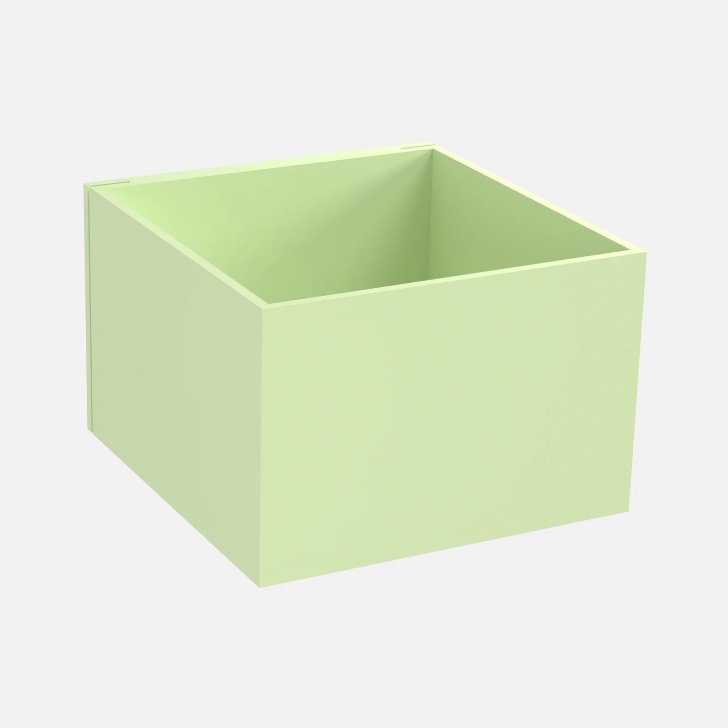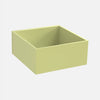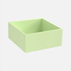 Drei modulare Cubit Regalboxen, zwei in hellgrün und eine in Nussbaumfurnier, frei auf dem Boden arrangiert, eine weitere auf einem schwarzen Metallgestell