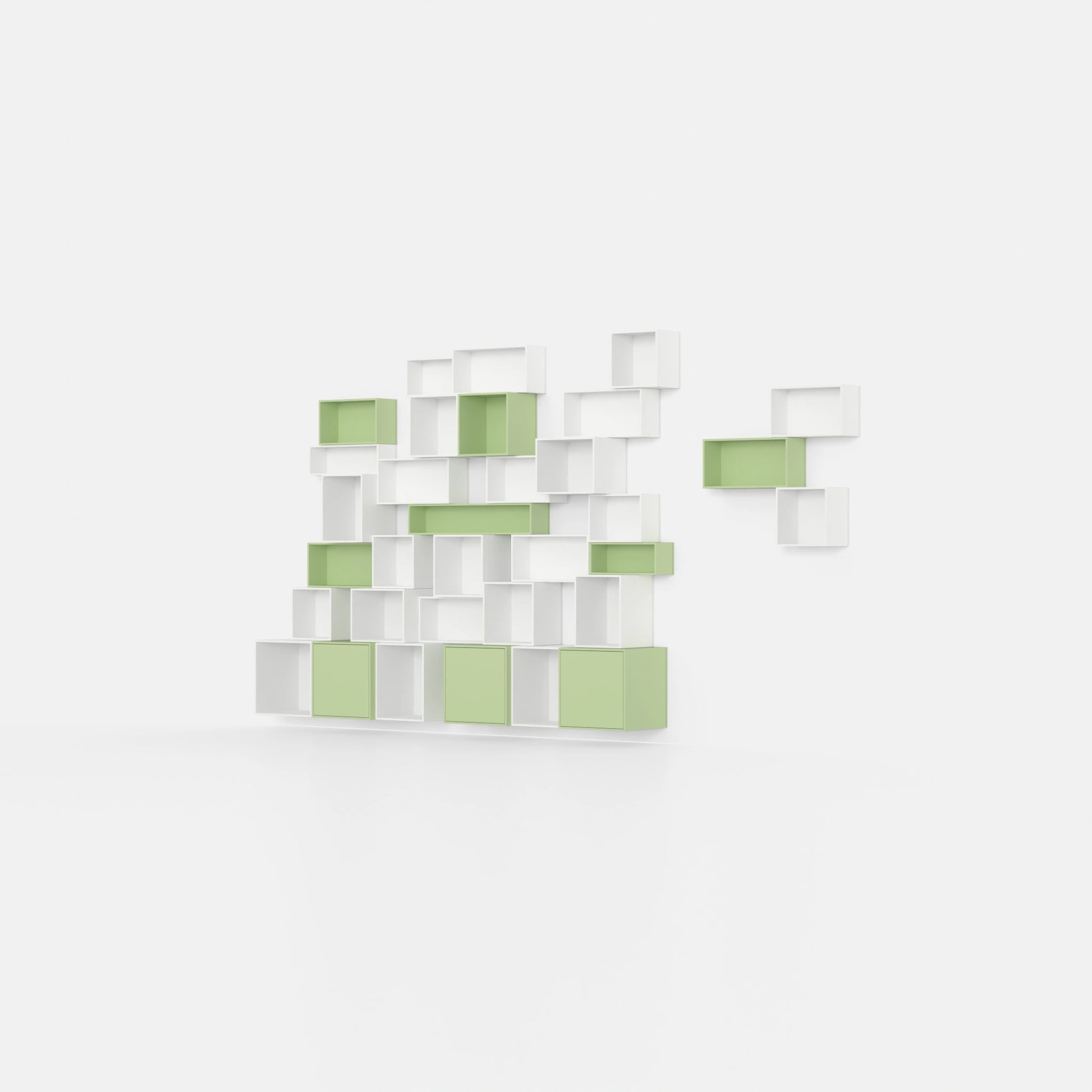 Drei modulare Cubit Regalboxen, zwei in hellgrün und eine in Nussbaumfurnier, frei auf dem Boden arrangiert, eine weitere auf einem schwarzen Metallgestell