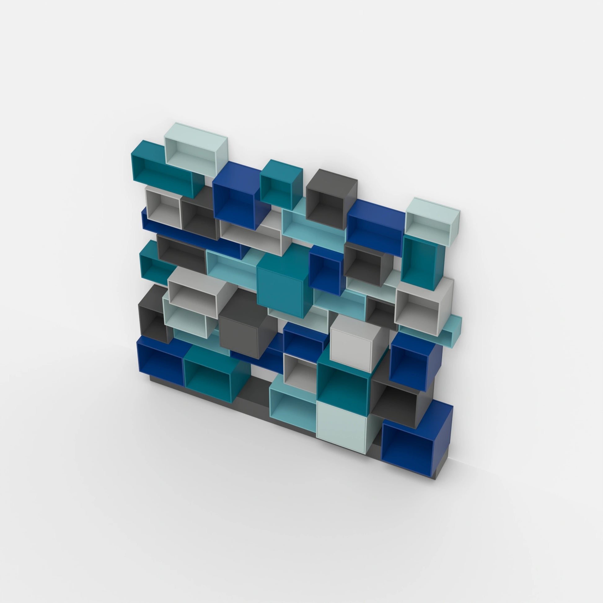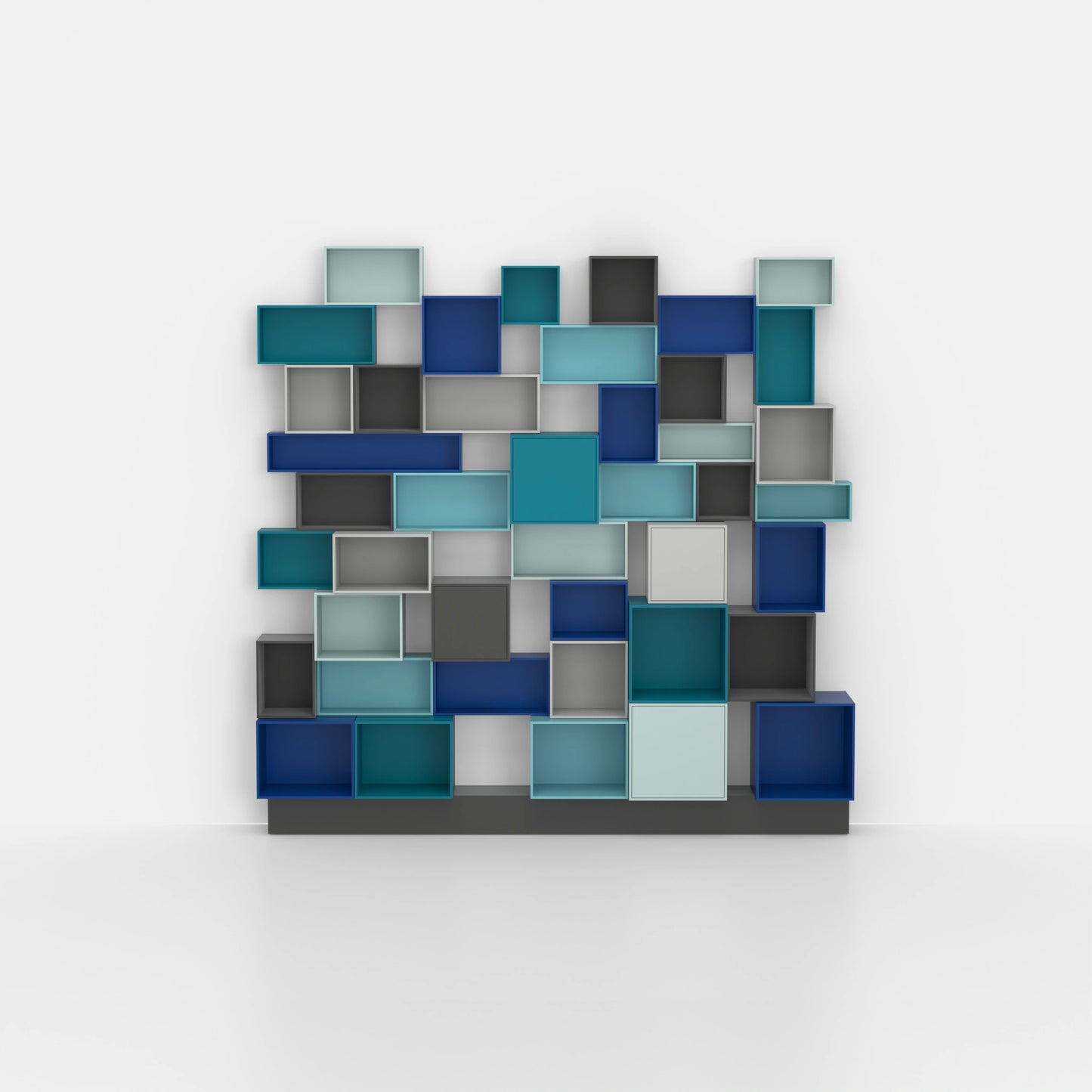 Die Regalmodule orientieren sich an den gängigen Literatur- und Musikformaten, z.B. Din A4, A5, Aktenordnern, Atlanten, Bildbänden & Schallplatten. Dieses vom Inhalt kommende Größen-Raster ermöglicht einen einzigartigen skulpturalen Look.
