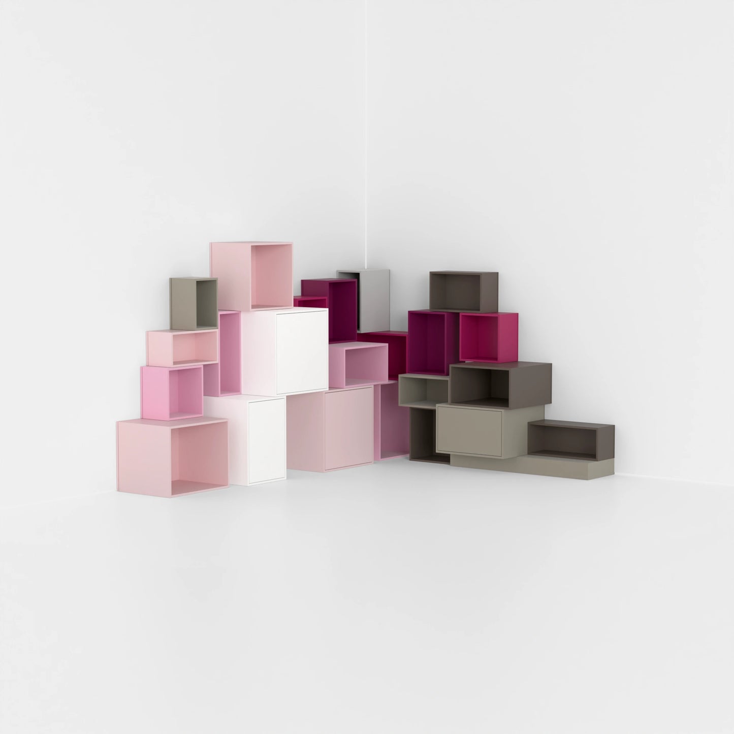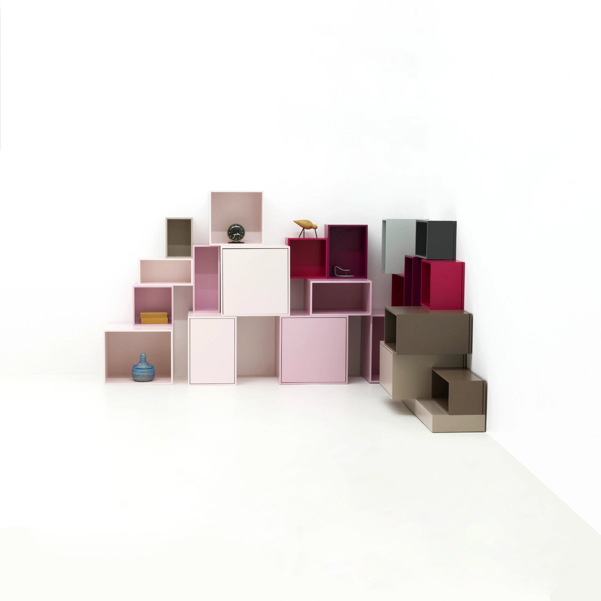 Regalaufbau mit verschiedenen Cubit Modulen in Rosa- und Naturtönen, kombiniert mit Türmodulen und offenen Modulen