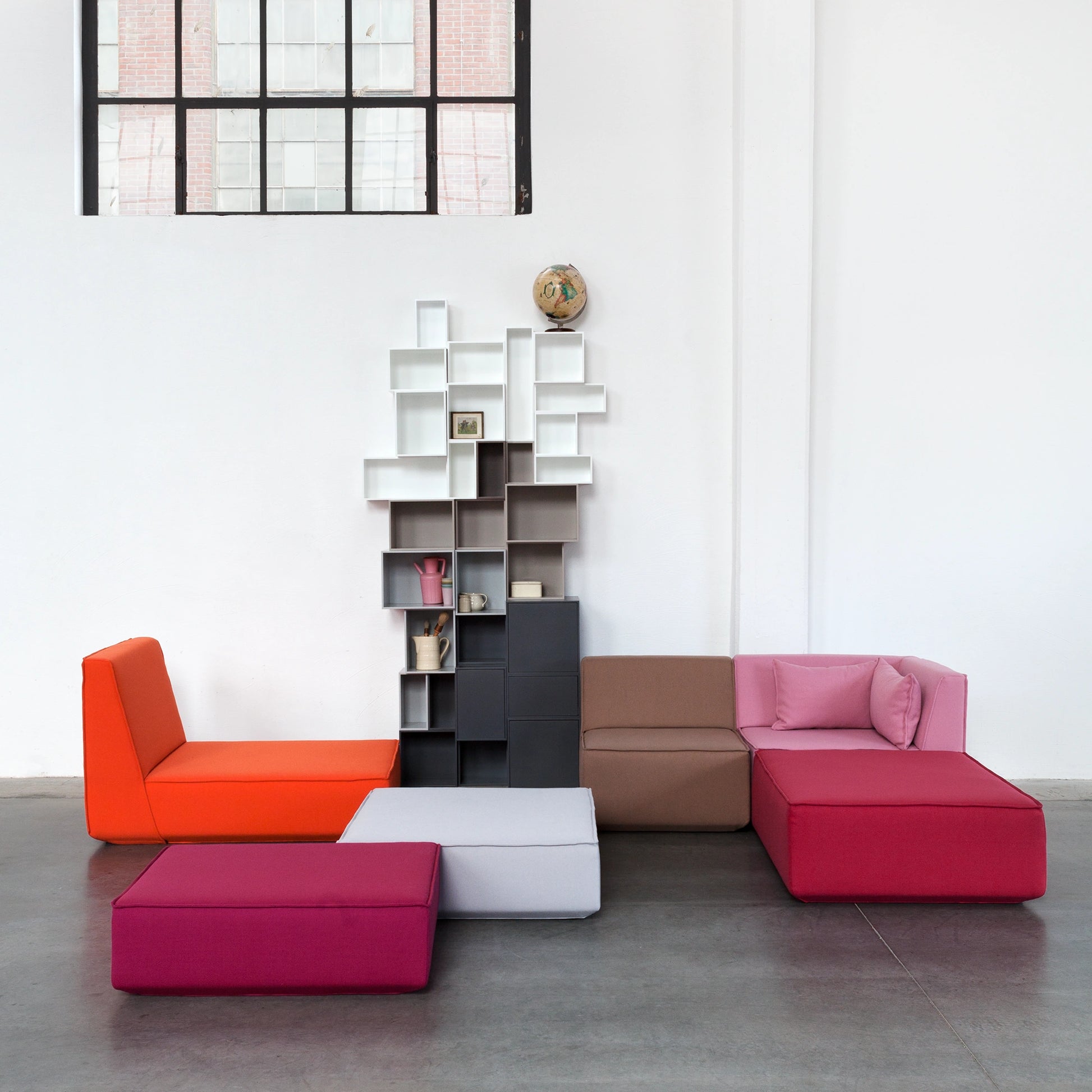 Cubit Regalwand aus farbigen Modulen in Rot-, Rosa- und Gelbtönen, dynamisch angeordnet für ein lebendiges Raumdesign