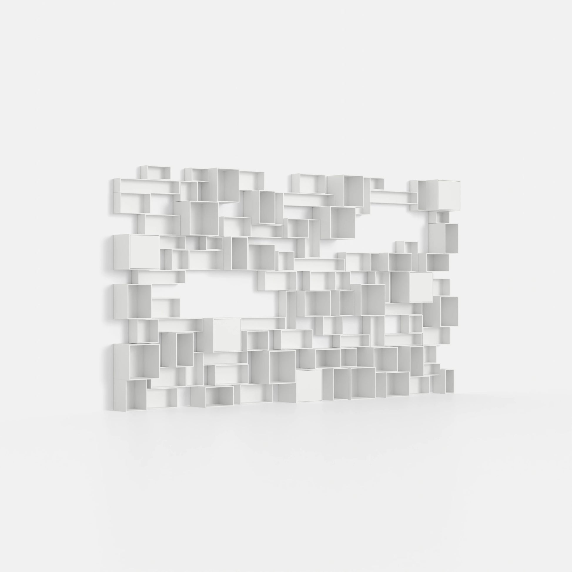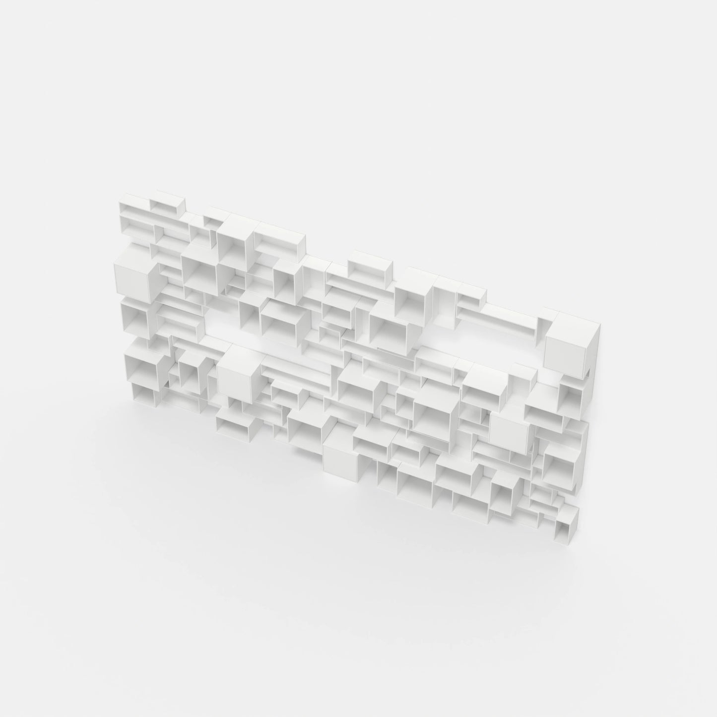Die Regalmodule orientieren sich an den gängigen Literatur- und Musikformaten, z.B. Din A4, A5, Aktenordnern, Atlanten, Bildbänden & Schallplatten. Dieses vom Inhalt kommende Größen-Raster ermöglicht einen einzigartigen skulpturalen Look.