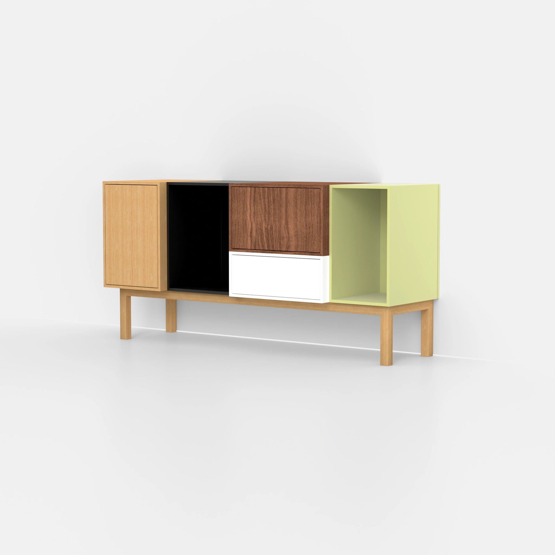 Drei modulare Cubit Regalboxen, zwei in hellgrün und eine in Nussbaumfurnier, frei auf dem Boden arrangiert, eine weitere auf einem schwarzen Metallgestell