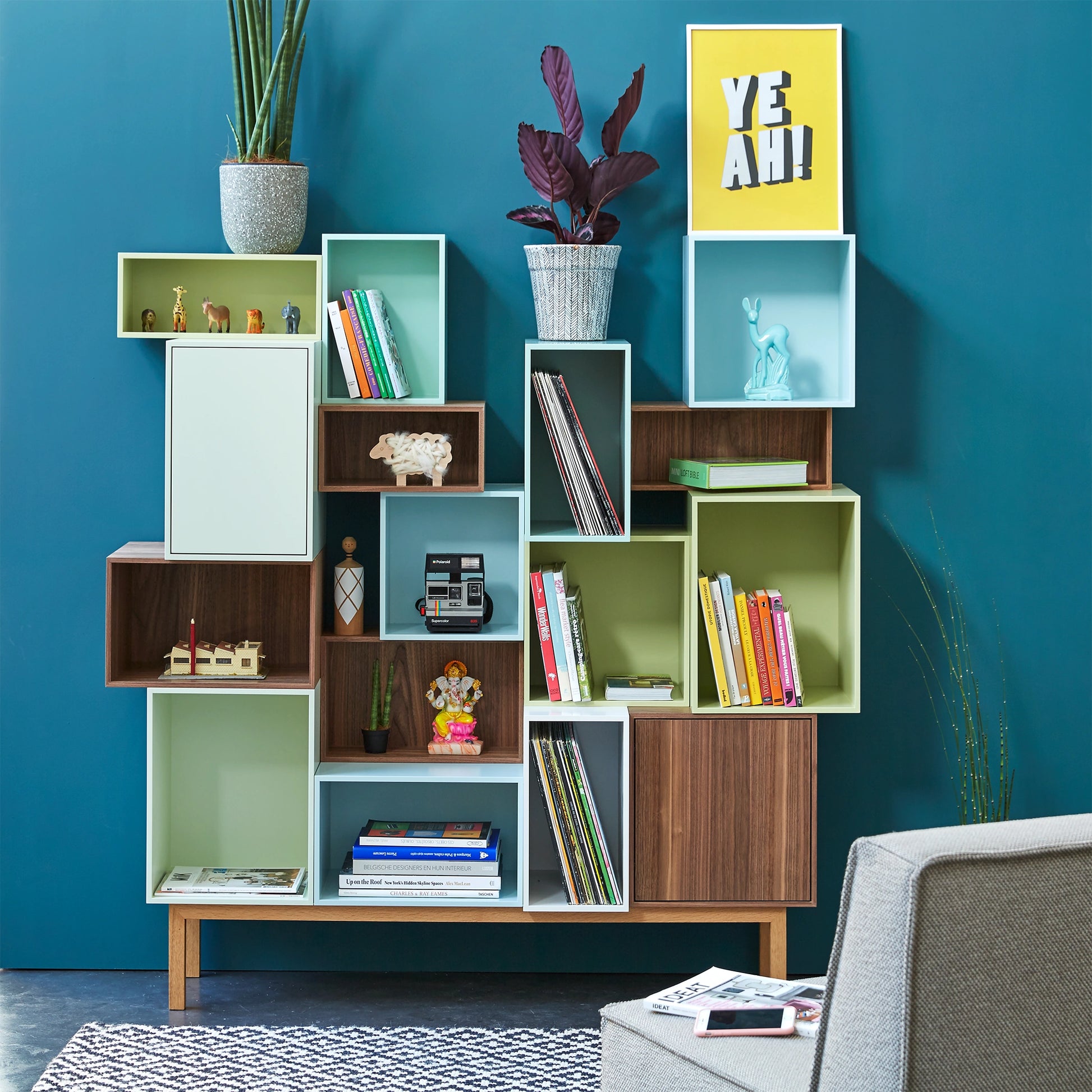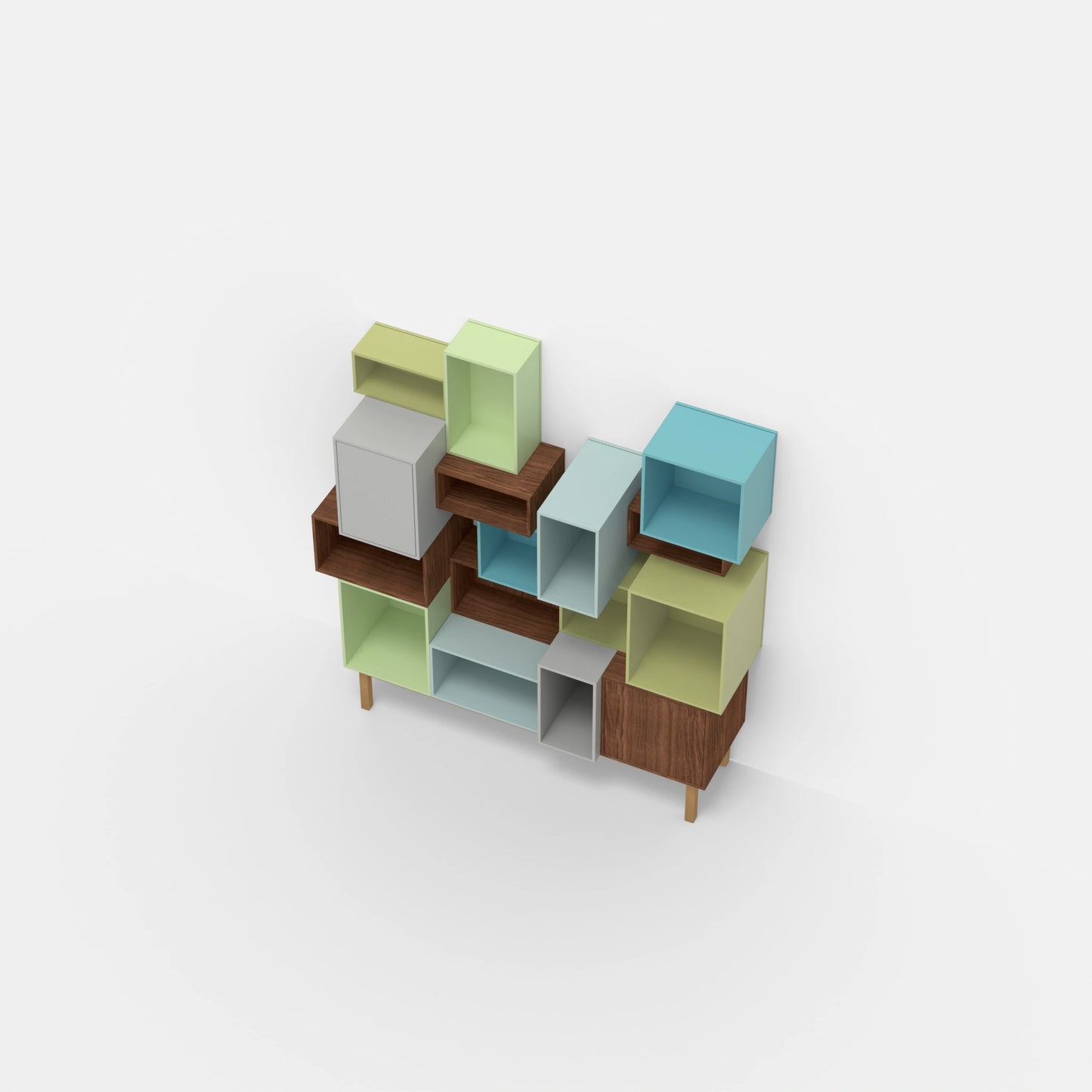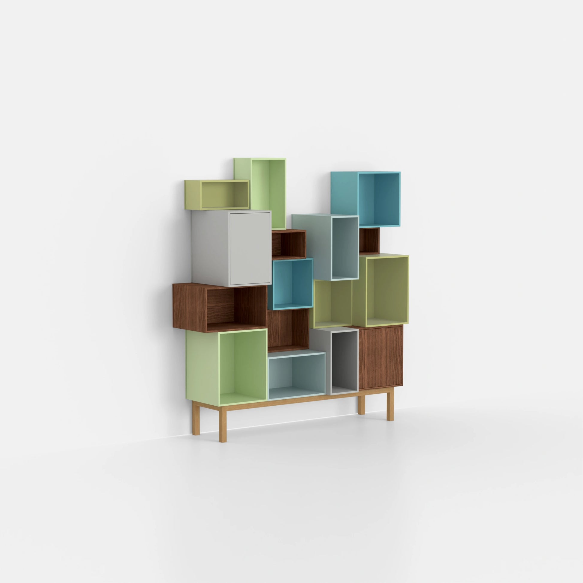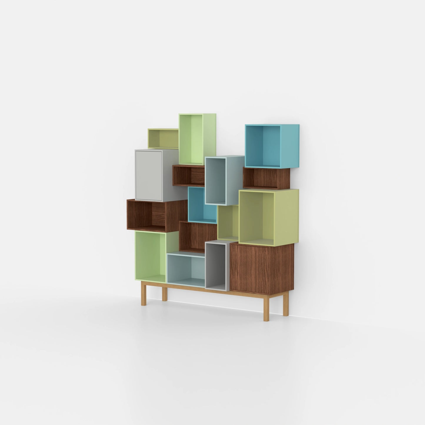 Drei modulare Cubit Regalboxen, zwei in hellgrün und eine in Nussbaumfurnier, frei auf dem Boden arrangiert, eine weitere auf einem schwarzen Metallgestell