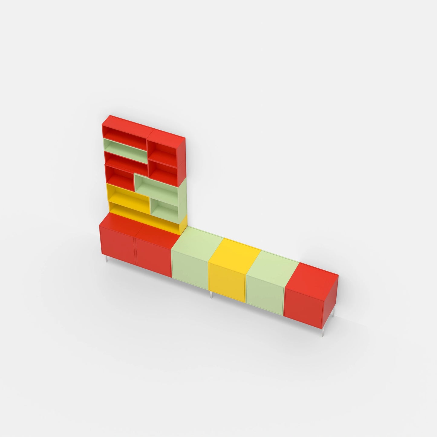 Cubit Regalwand aus farbigen Modulen in Rot-, Rosa- und Gelbtönen, dynamisch angeordnet für ein lebendiges Raumdesign