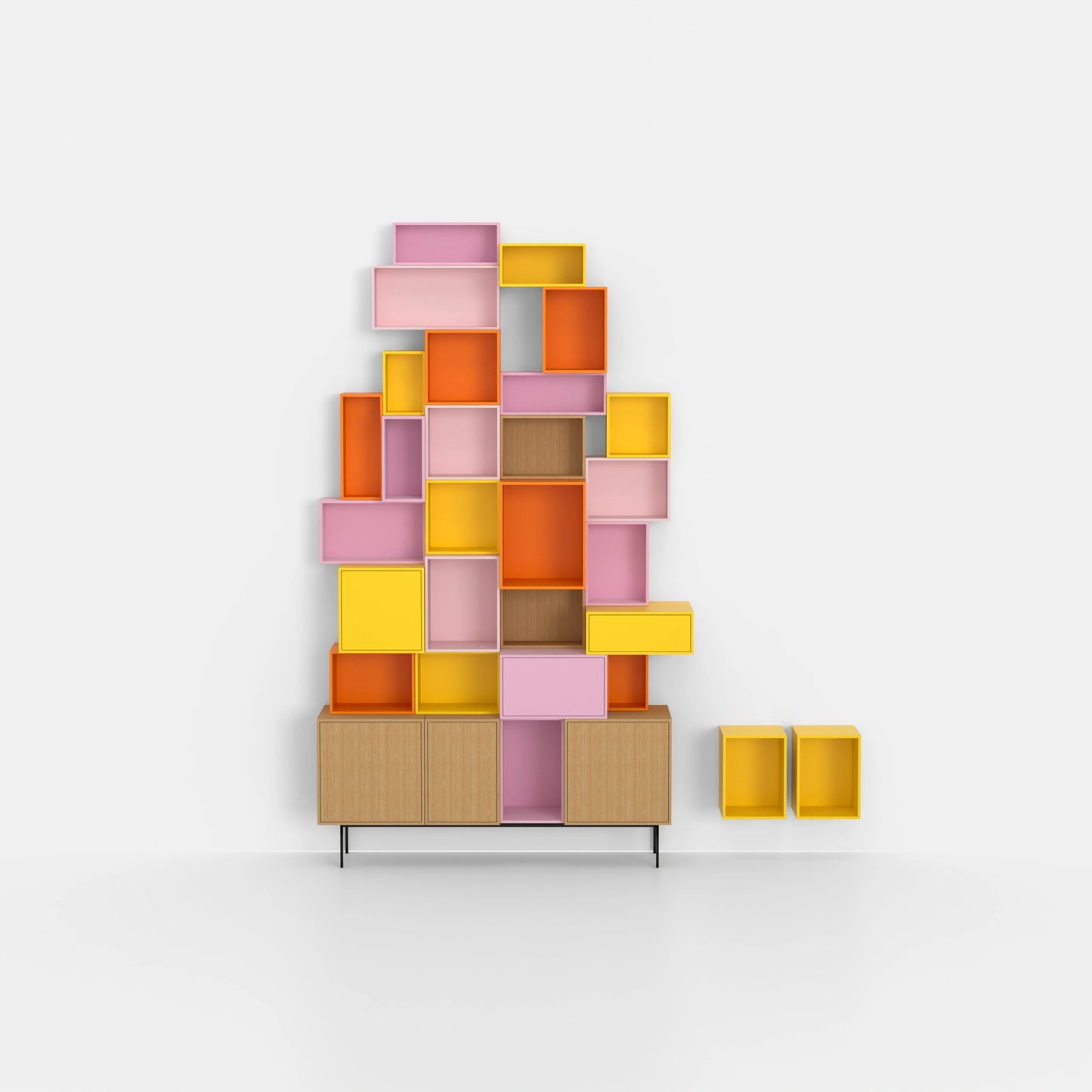 Cubit Regalwand aus farbigen Modulen in Rot-, Rosa- und Gelbtönen, dynamisch angeordnet für ein lebendiges Raumdesign