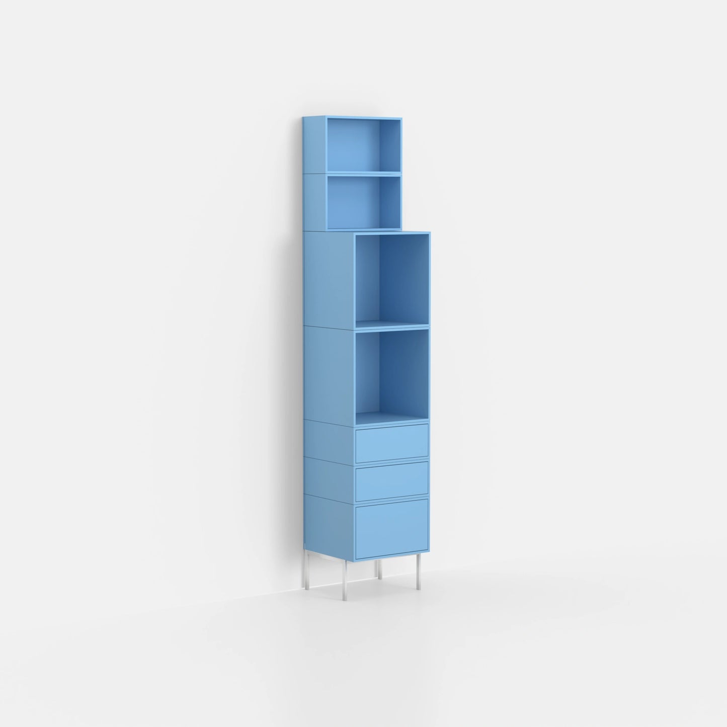 Die Regalmodule orientieren sich an den gängigen Literatur- und Musikformaten, z.B. Din A4, A5, Aktenordnern, Atlanten, Bildbänden & Schallplatten. Dieses vom Inhalt kommende Größen-Raster ermöglicht einen einzigartigen skulpturalen Look.