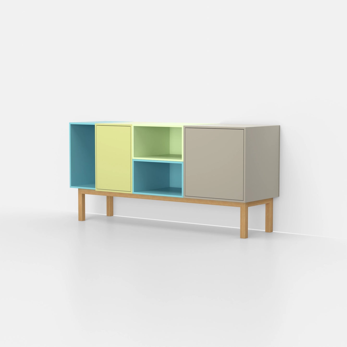 Drei modulare Cubit Regalboxen, zwei in hellgrün und eine in Nussbaumfurnier, frei auf dem Boden arrangiert, eine weitere auf einem schwarzen Metallgestell