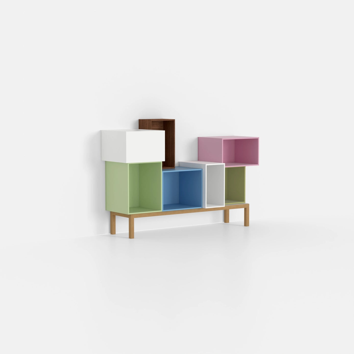 Drei modulare Cubit Regalboxen, zwei in hellgrün und eine in Nussbaumfurnier, frei auf dem Boden arrangiert, eine weitere auf einem schwarzen Metallgestell