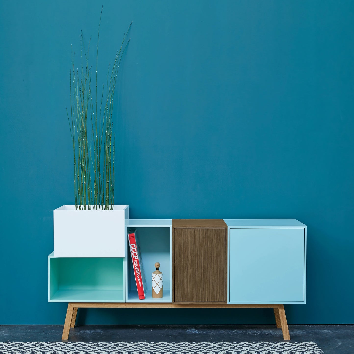 Drei modulare Cubit Regalboxen, zwei in hellgrün und eine in Nussbaumfurnier, frei auf dem Boden arrangiert, eine weitere auf einem schwarzen Metallgestell