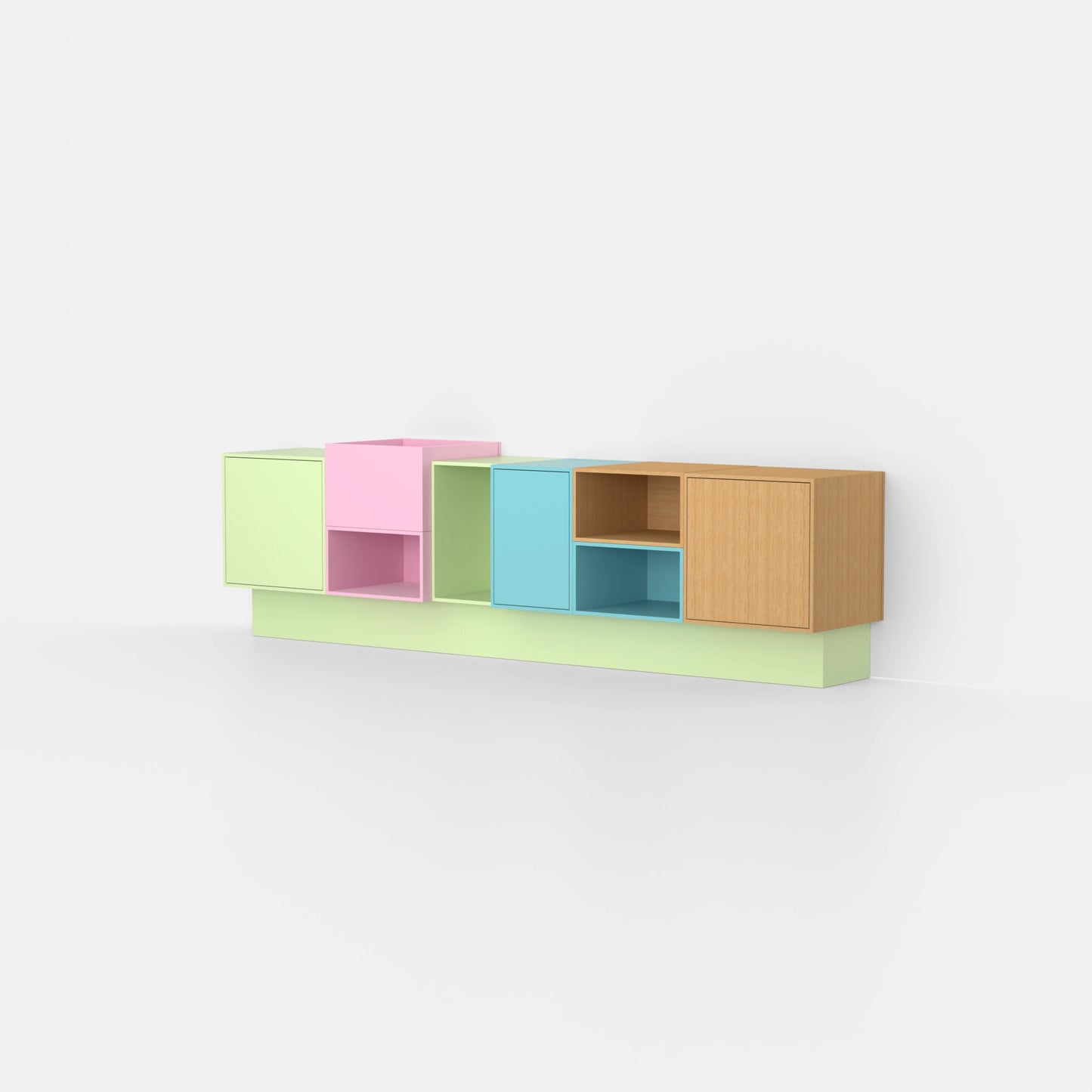 Drei modulare Cubit Regalboxen, zwei in hellgrün und eine in Nussbaumfurnier, frei auf dem Boden arrangiert, eine weitere auf einem schwarzen Metallgestell