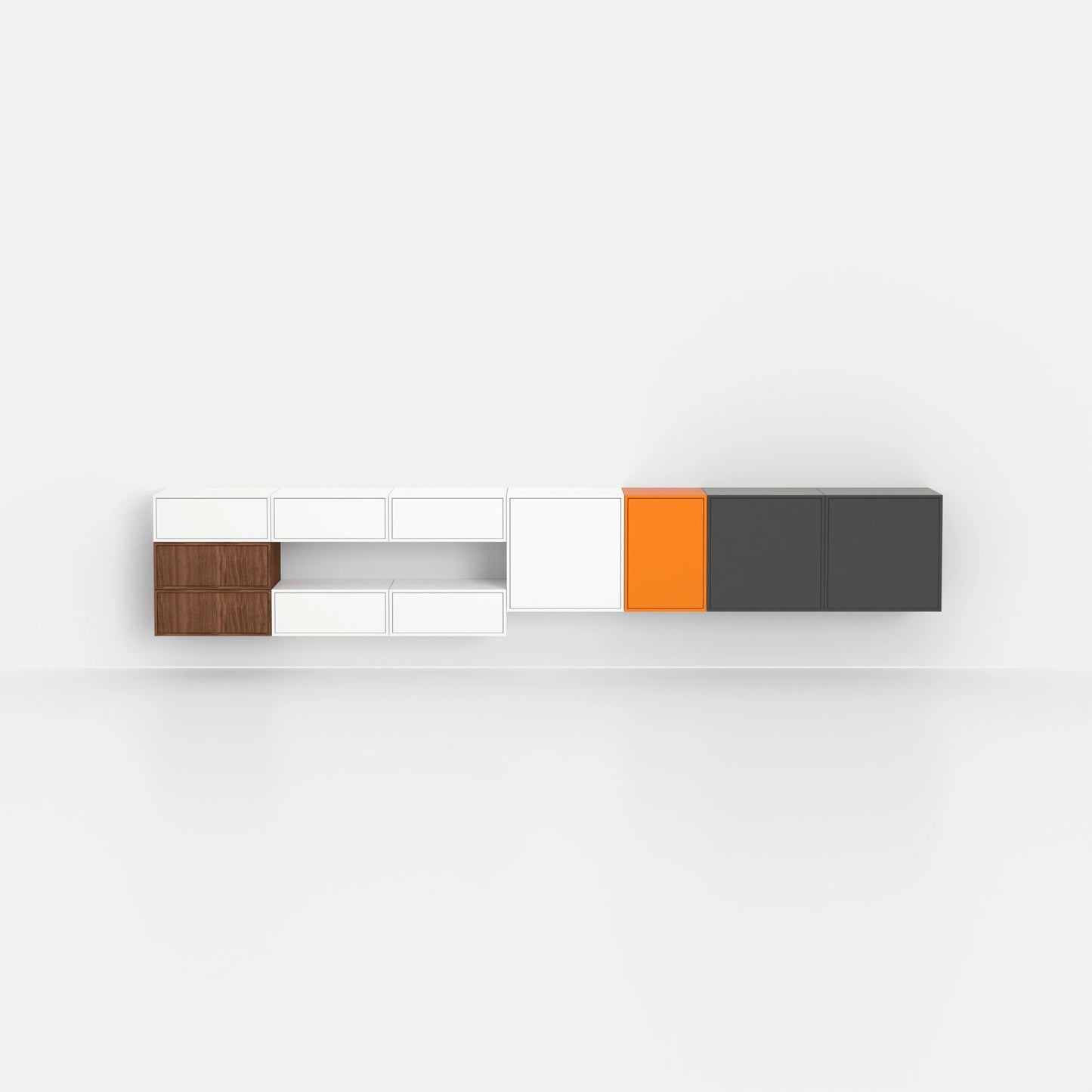 Erhältlich in Weiß, Buddha-Orange, Dunkel-Grau und Walnuss-Holzton, passt es sich mühelos an verschiedene Stilrichtungen an. Möchten Sie einen warmen Akzent? Wählen Sie Walnuss. Bevorzugen Sie Frische? Dann ist Weiß ideal. Buddha-Orange bringt Energie in den Raum.
