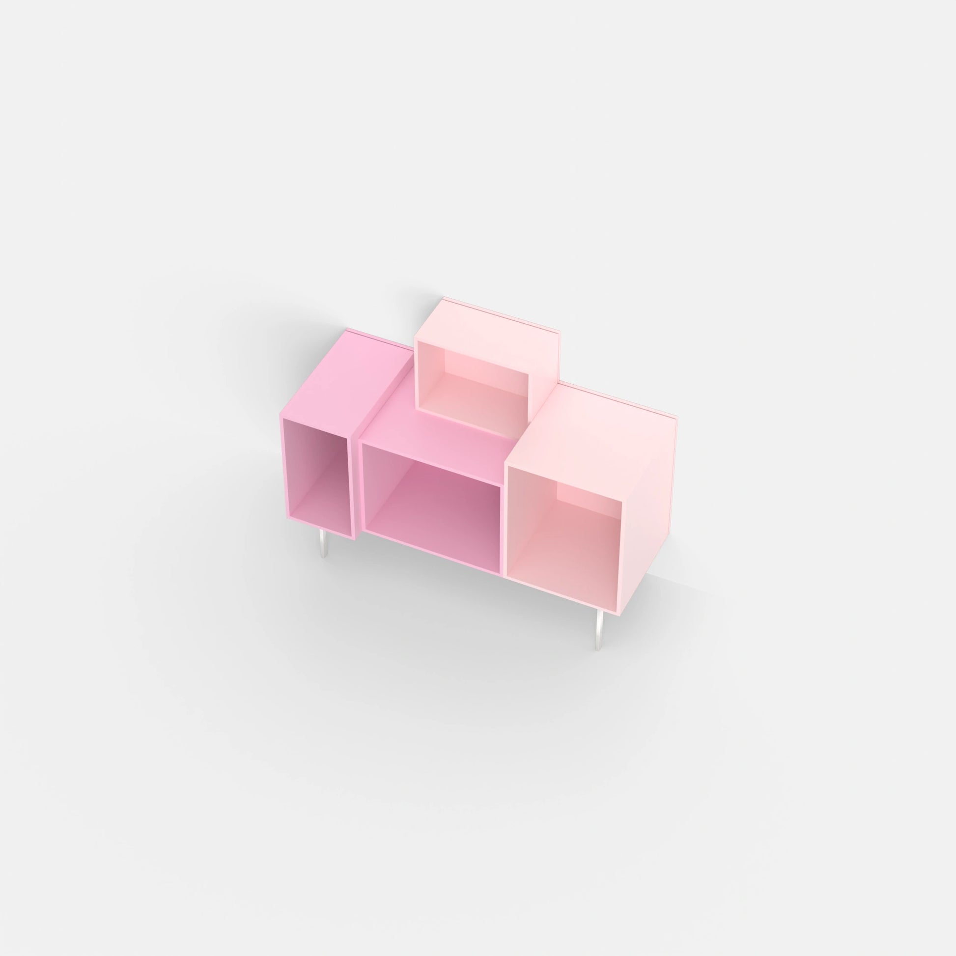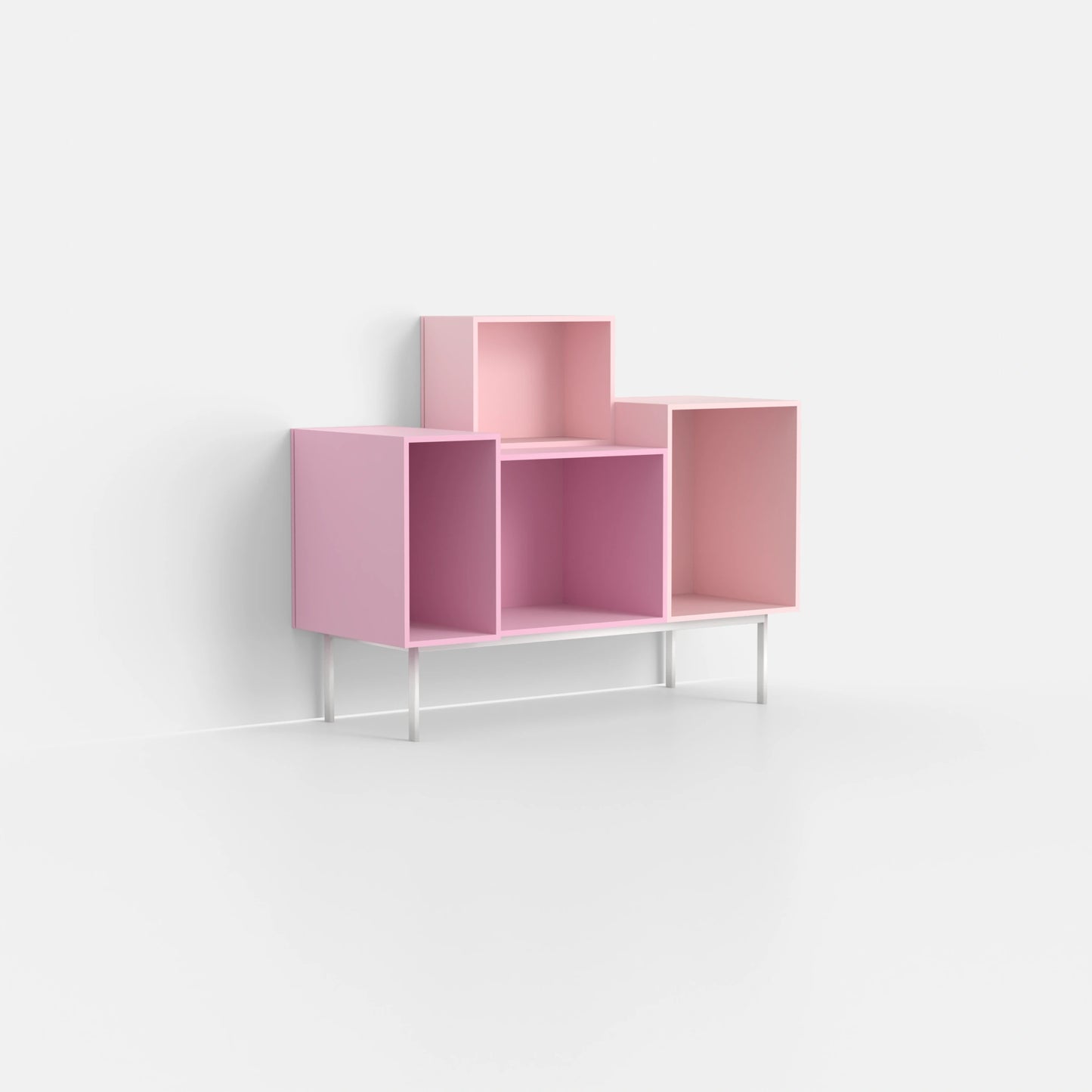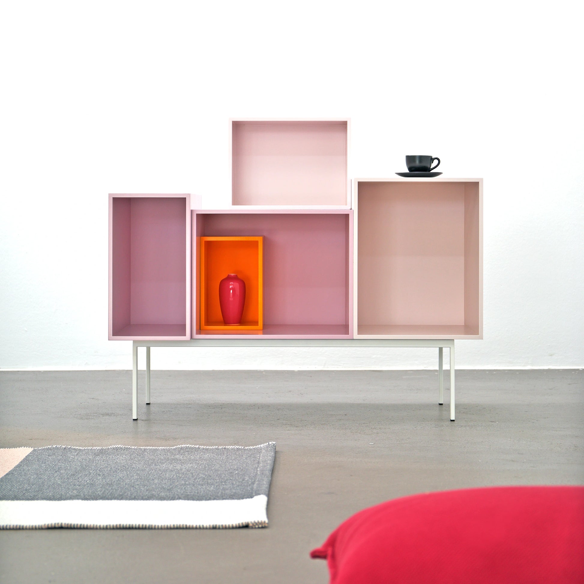 Regalaufbau mit verschiedenen Cubit Modulen in Rosa- und Naturtönen, kombiniert mit Türmodulen und offenen Modulen