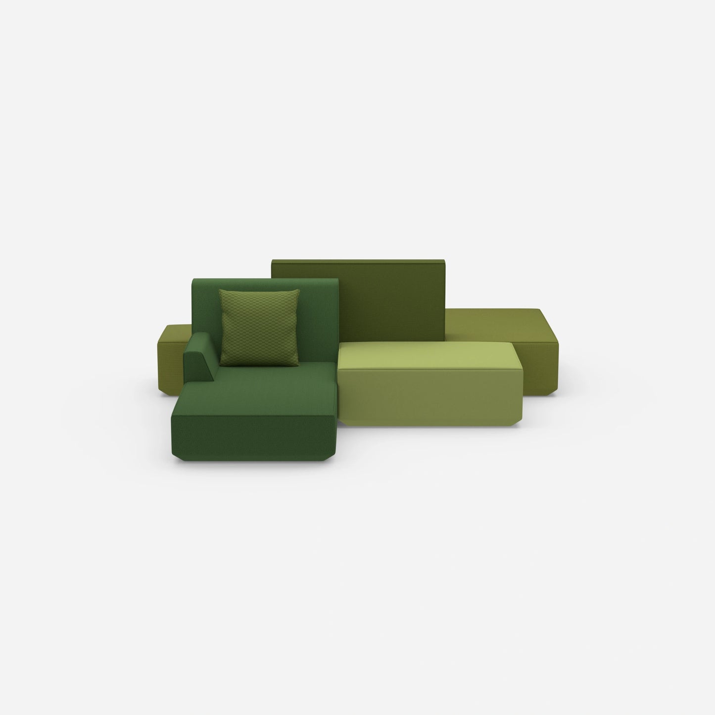 Verschieden konfigurierte Cubit Sofa Module in einem großen, offenen Raum – zeigt die Vielfalt an Kombinationsmöglichkeiten und Farben