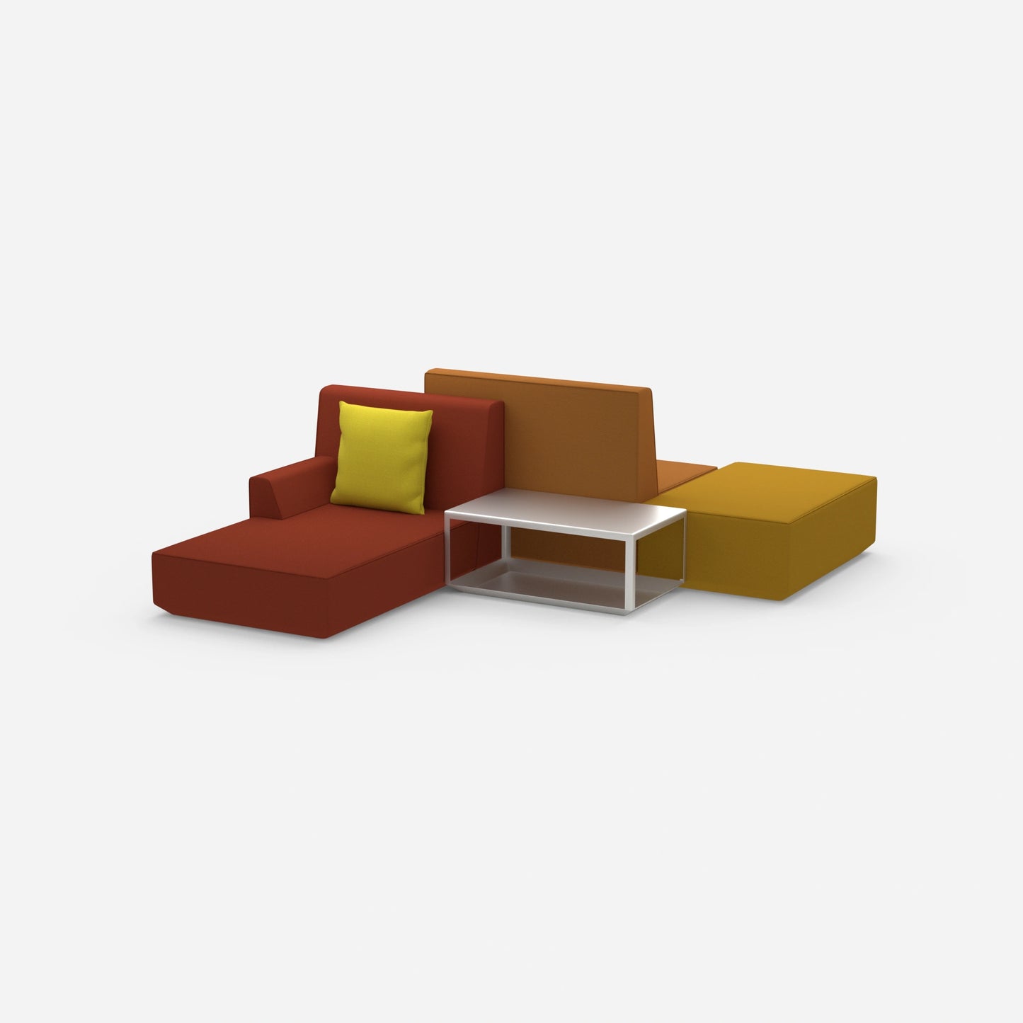 Drei Poufmodule schaffen eine einladende Sitzfläche. Das Recamierenmodul links lädt zum Ausstrecken ein. Zwei Kissen und ein Rückenmodul sorgen für zusätzliche Gemütlichkeit. Die Farbgestaltung beeindruckt mit einer Vielfalt von anthrazit, über bordeaux bis hin zu curry. Weitere Farben sind verfügbar, um jedem Raumkonzept gerecht zu werden.