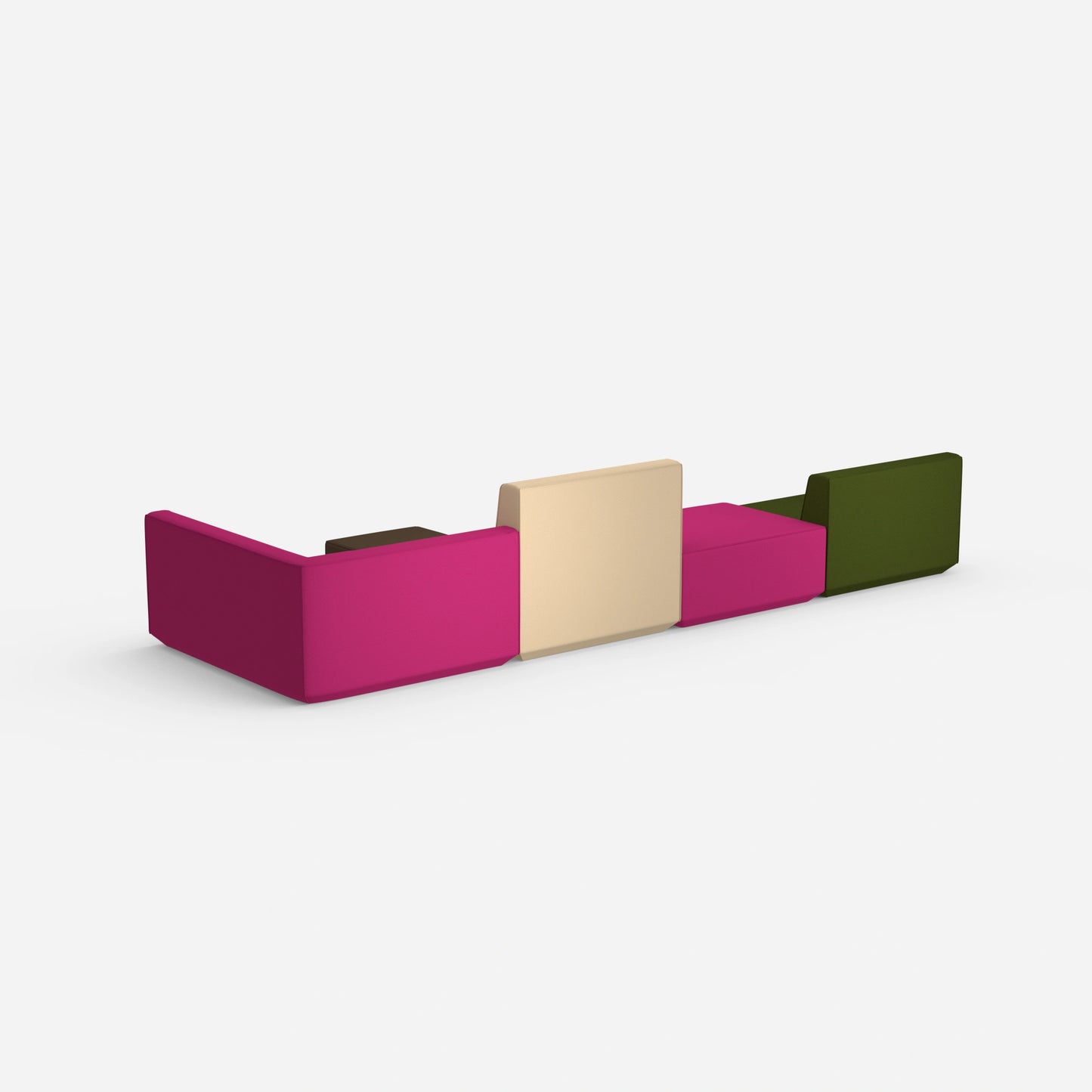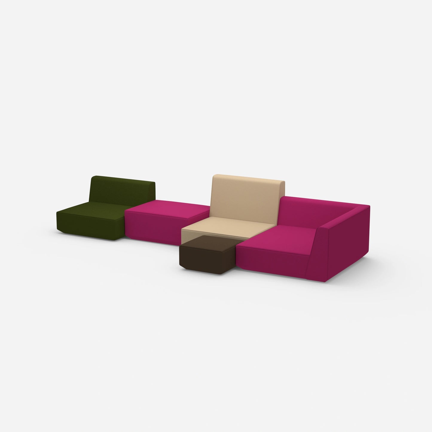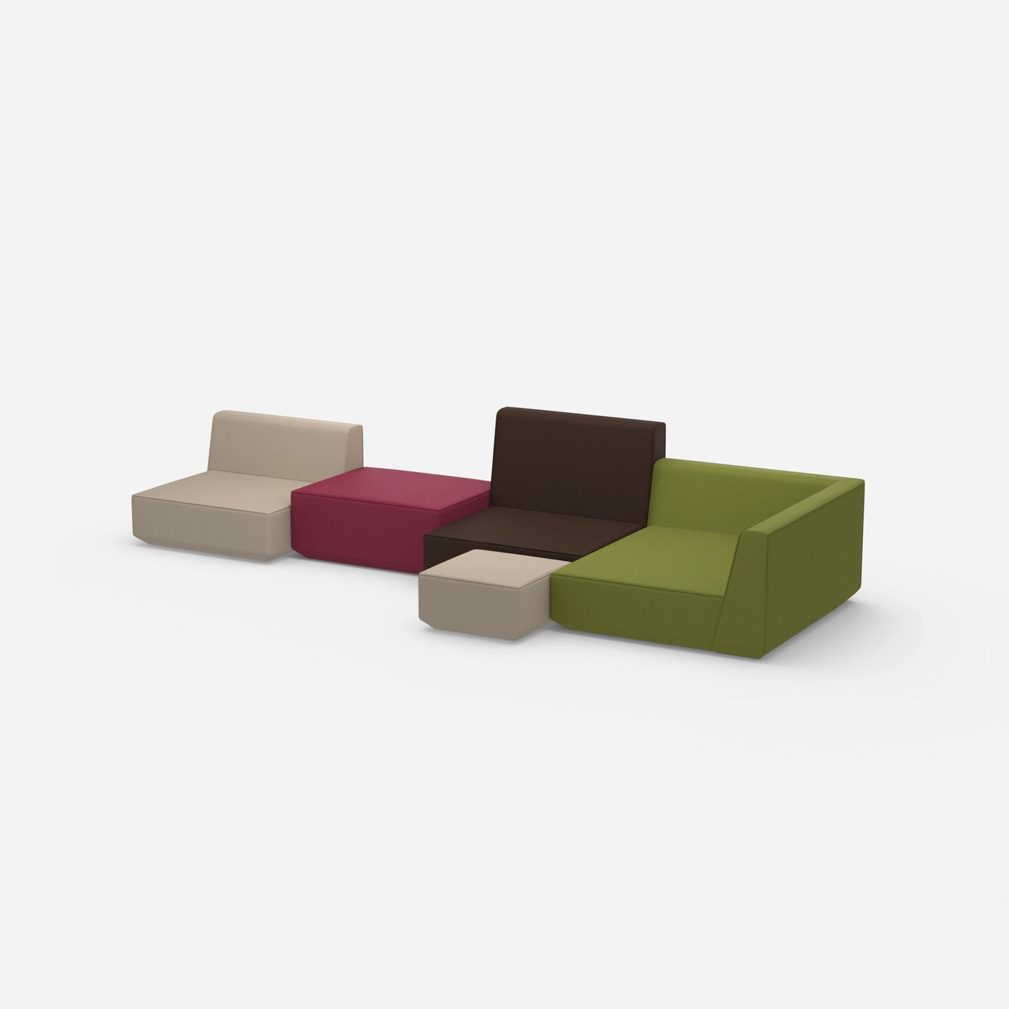 Verschieden konfigurierte Cubit Sofa Module in einem großen, offenen Raum – zeigt die Vielfalt an Kombinationsmöglichkeiten und Farben